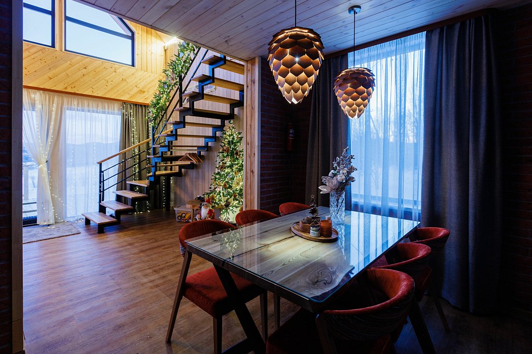 Комфортный двухэтажный дом с двойным светом и панорамным остеклением, которое позволяет любоваться невероятными рассветами, прекрасным видом на горы и березовой рощей. Дизайн дома выполнен в сдержанных тонах с яркими акцентами, а стены украшены картинами Дальневосточных художников.