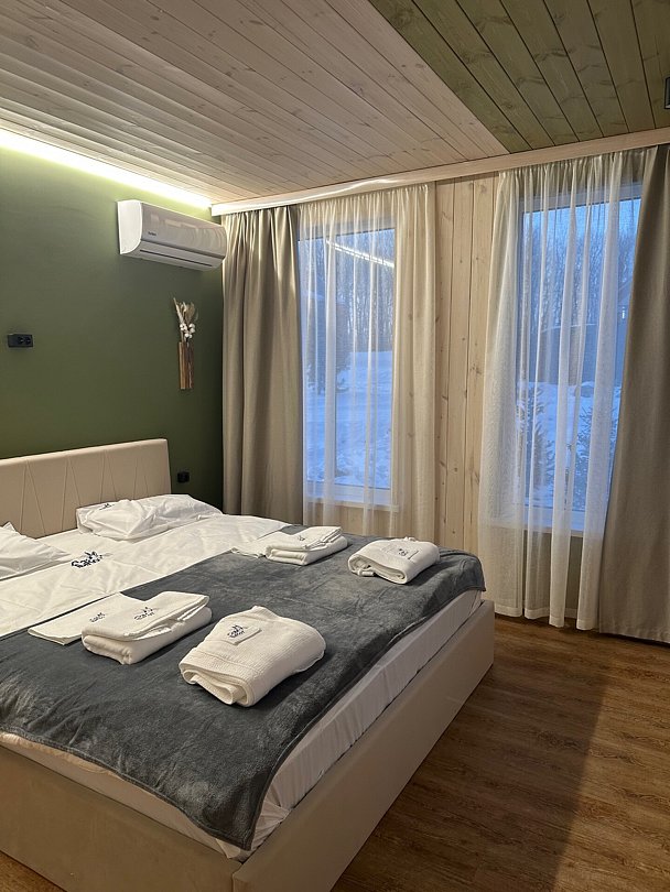 В доме две односпальные кровати, две двуспальные, большой раскладной диван.