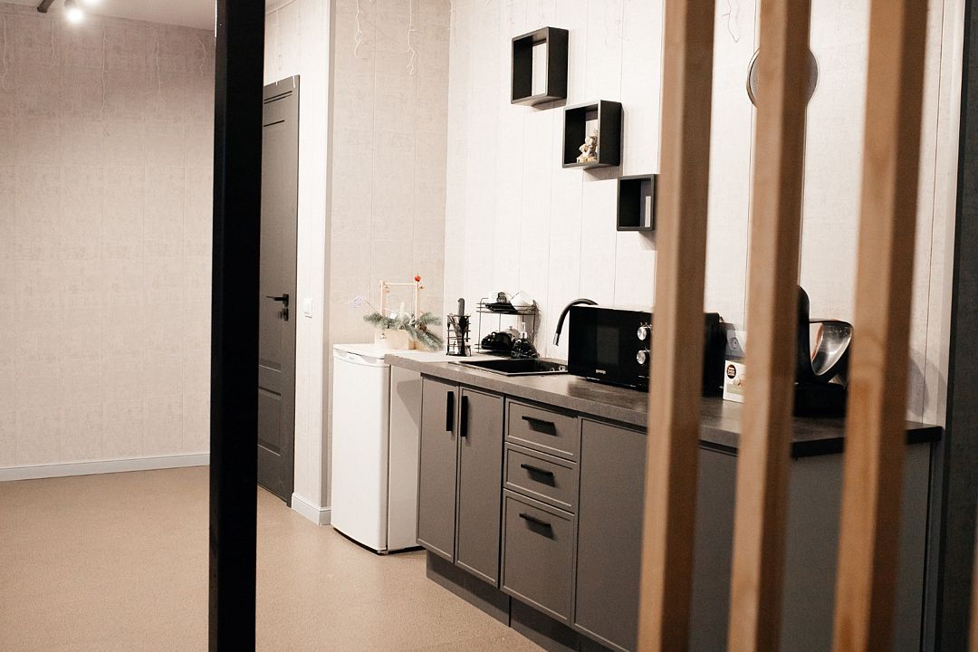 Кухня оборудована всем необходимым для готовки. А именно индукционной плитой, холодильником, микроволновой печью и набором посуды. А на прилегающей территории есть мангальная зона.