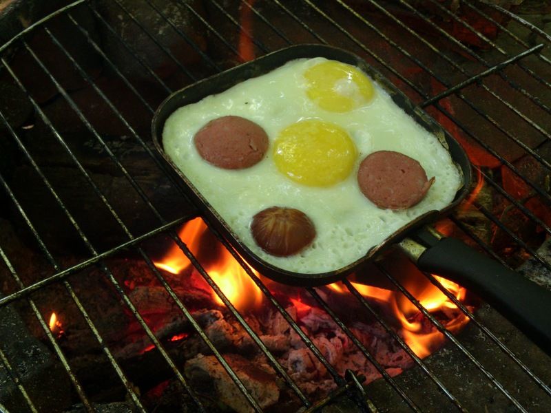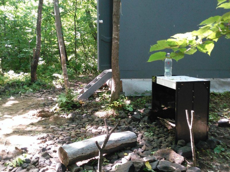 На территории предусмотрено место для костра, выложенное камнями, а также установлен стол для нарезки мяса или выкладки уже жареных шашлыков и приготовленных салатов. Внутри дома имеется отопление, электричество и розетка. Комфортные спальные места — два находятся внизу, а одно расположено сверху.