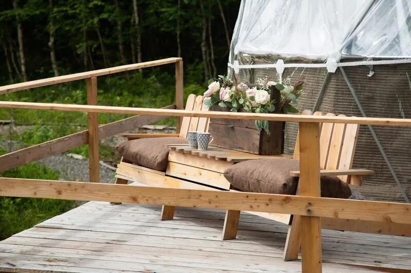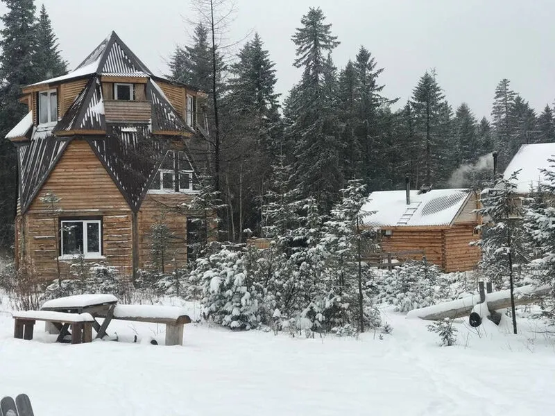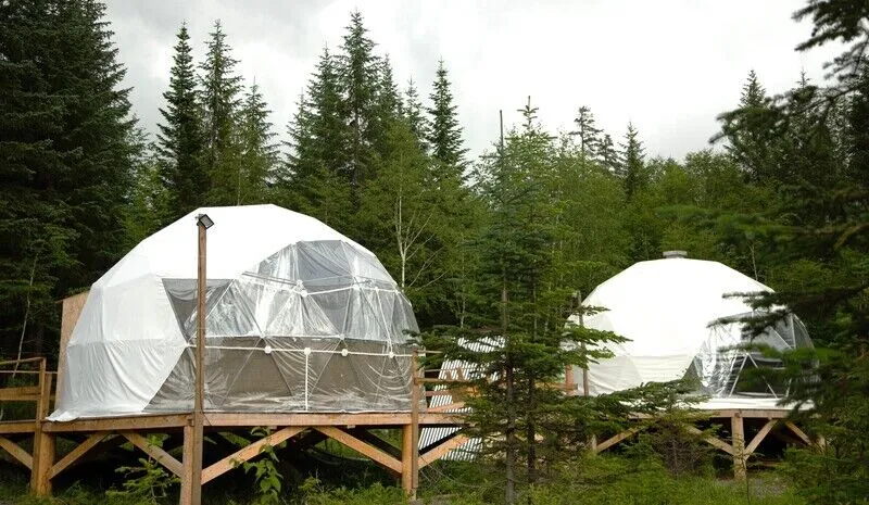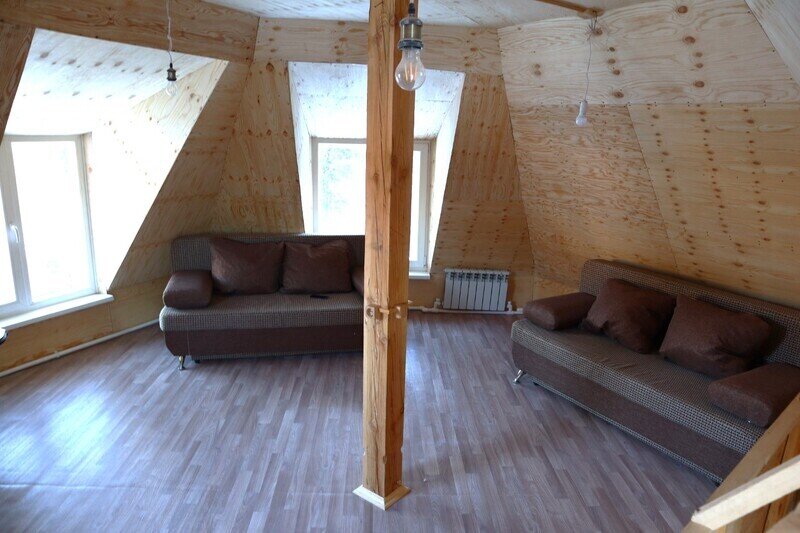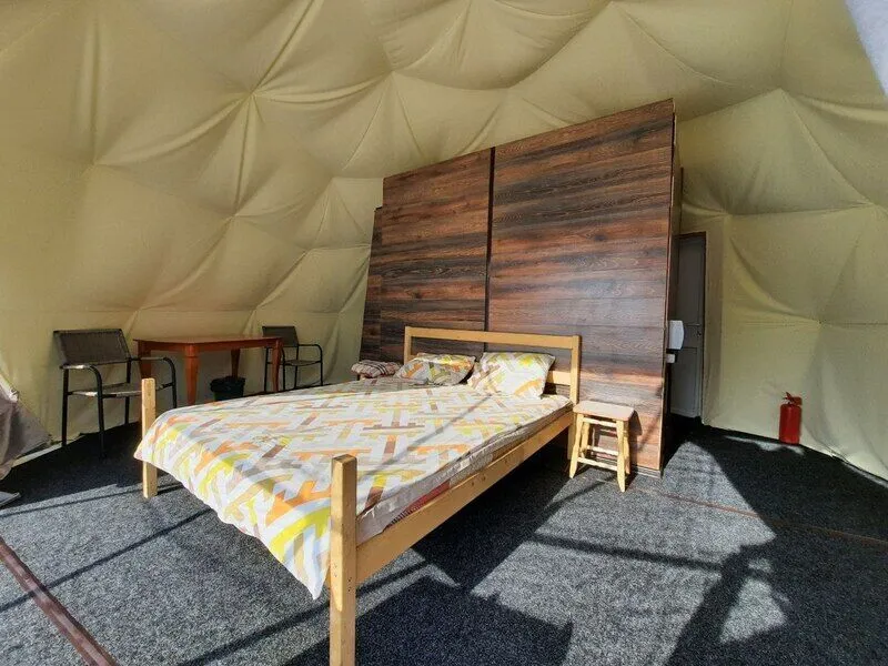 Для проживания предусмотрено 6 куполов, 2 шалаша и 3-этажный дом Гексагон. Купола – сферические строения по финской технологии, шалаши – двухэтажные деревянные здания с длинными скатными крышами. Гексагон – шестигранный деревянный дом с огромными окнами, самый комфортабельный вариант размещения, отдаленный от остальных корпусов.