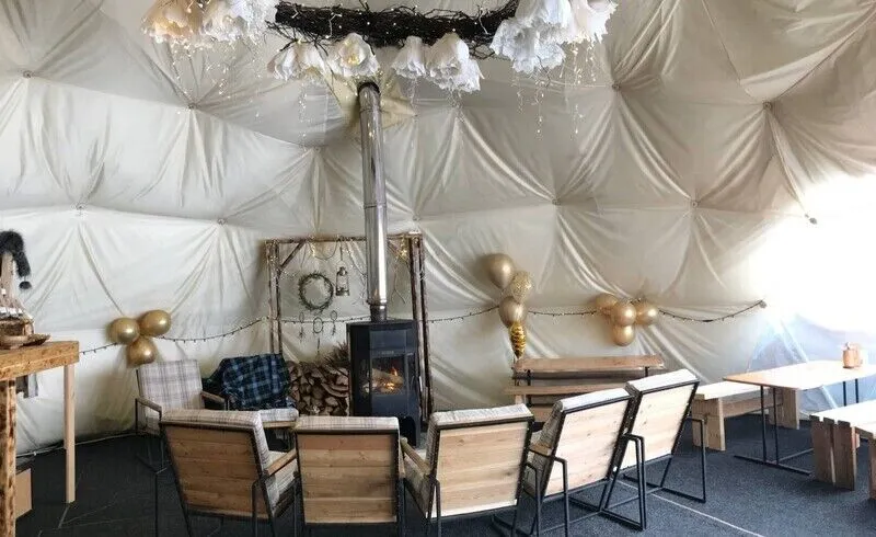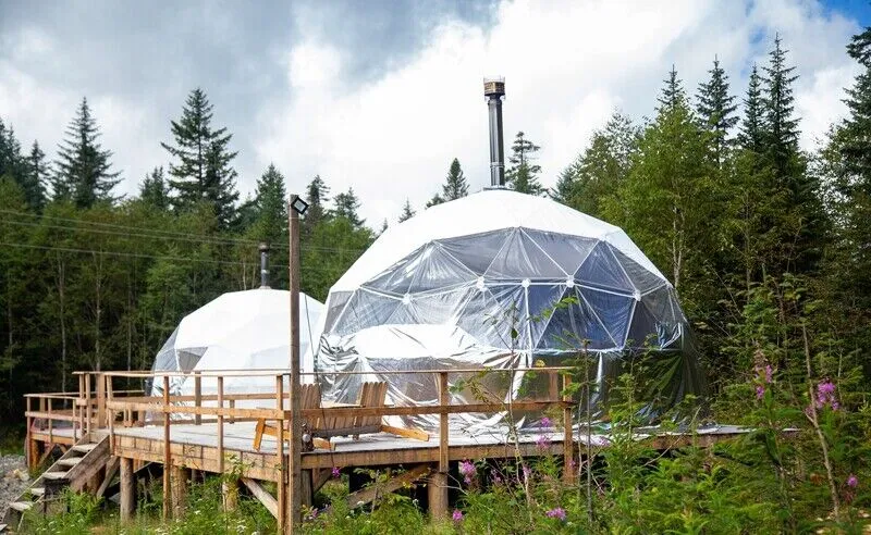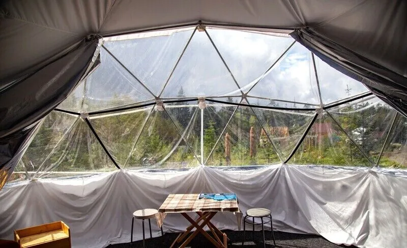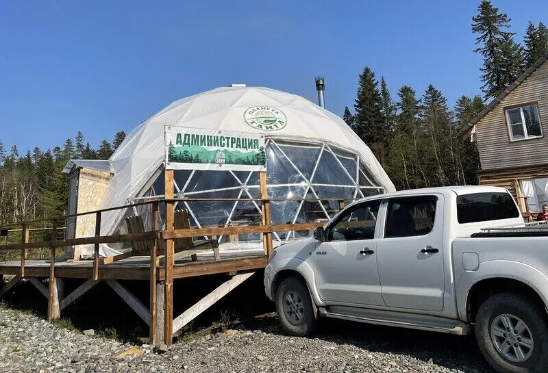 Большой купол на территории совмещает функции кафе, бара, вечернего кинотеатра и гостевого пространства. Доступ свободный. В глэмпинге работают повара, готовящие завтрак, обед или ужин по предварительному заказу. Мангалы для шашлыка и беседка установлены у каждого дома, есть банный комплекс с русской баней, фурако, сибирскими чанами и сауной-бочкой.