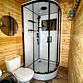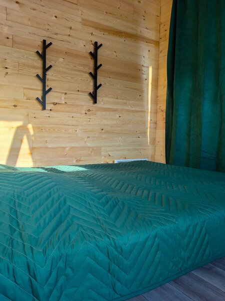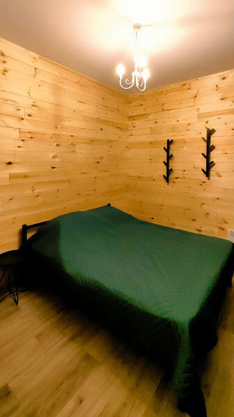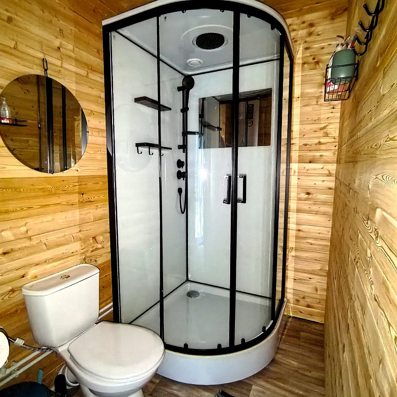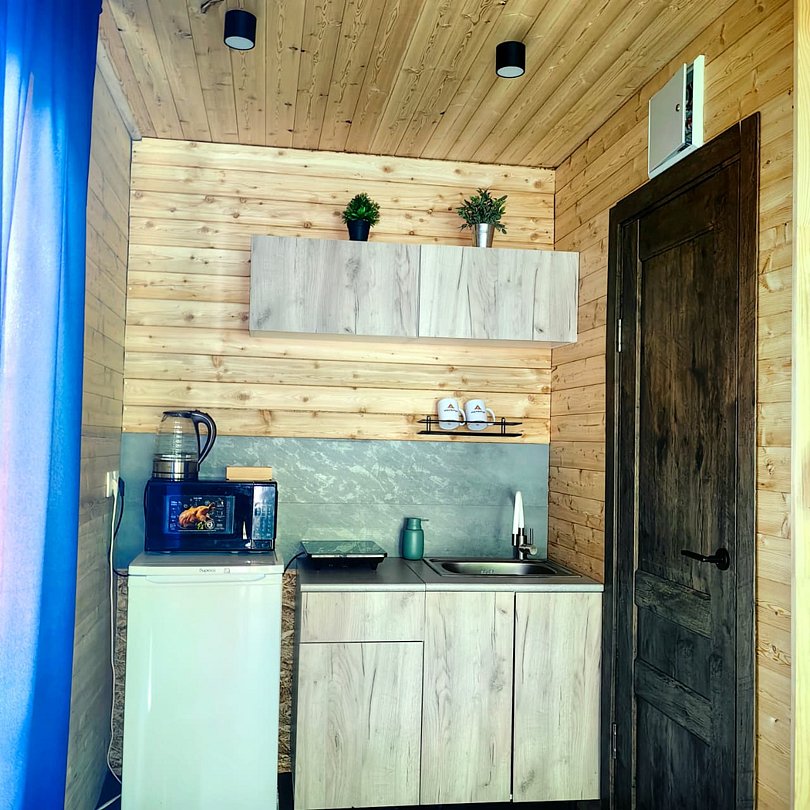 В домике спальня с двуспальной кроватью, санузел с душевой кабиной, кухонная зона. Кухня оборудованна всем необходимым для проживания.