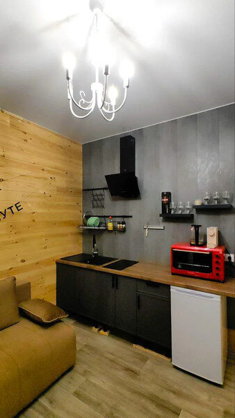 Кухня-гостиная: камин, телевизор с подключенными ОККО, КИНОПОИСК, СМАТРЕШКА, умная колонка Алиса, диван раскладной на два места, холодильник, варочная панель, микроволновая печь, чайник, капсульная кофемашина, капучинатор, посуда, шампуры, решетка для мангала.