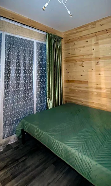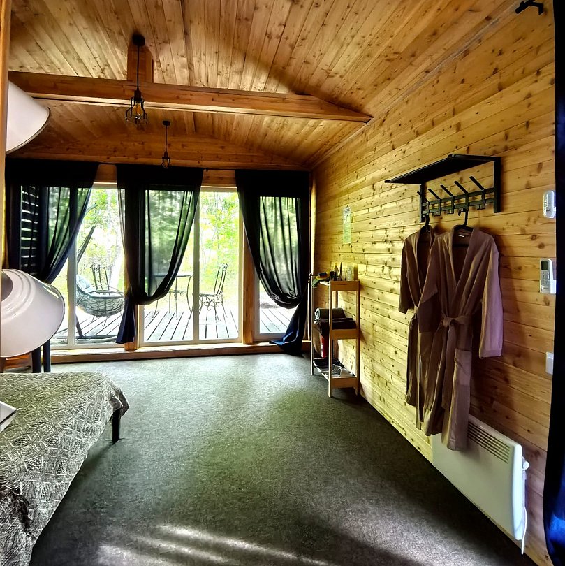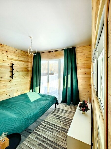 Номер в Гостевом доме с отдельным входом. В доме имеется спальная комната с двуспальной кроватью и видом на лес, санузел, кухня-гостиная с камином.