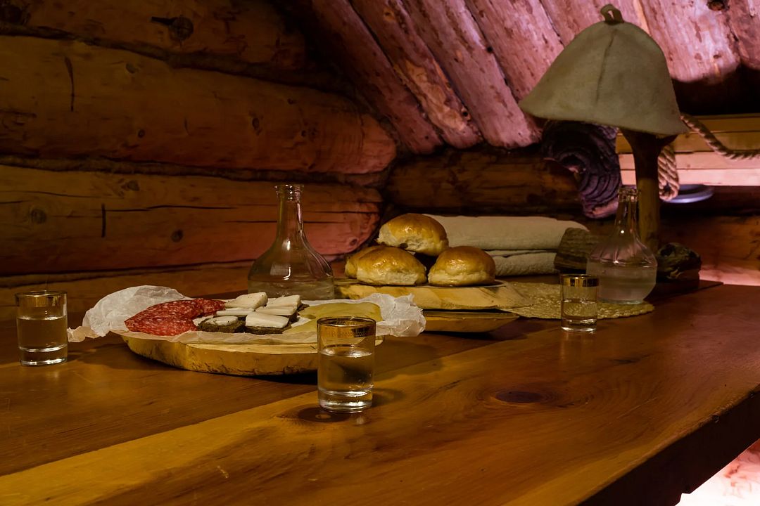 Там стоят кедровые столы из натурального кедра и большая русская печь для приготовления изысканных блюд по старинным рецептам.
