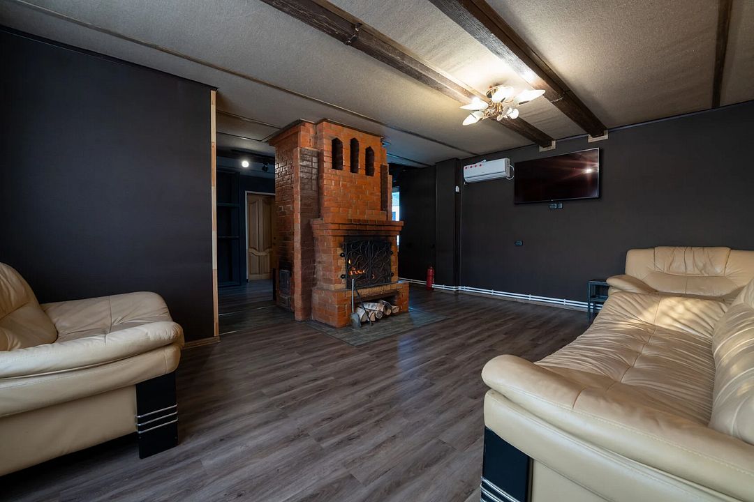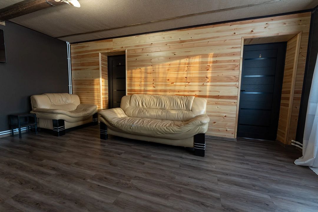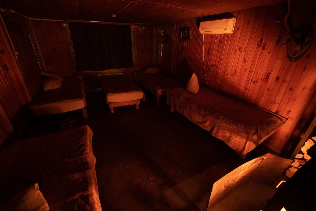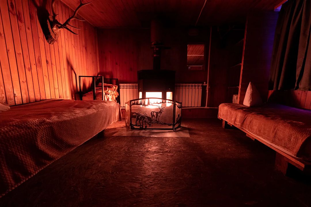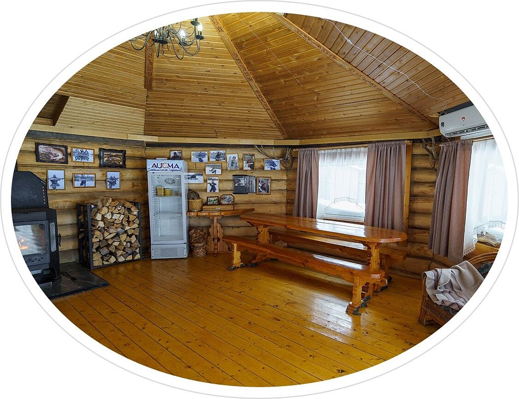 Гостиная — это большой рубленый бревенчатый дом вместимостью до 60 человек. Он сделан из огромных бревен в таёжно-охотничьем стиле, украшен шкурами диких зверей.