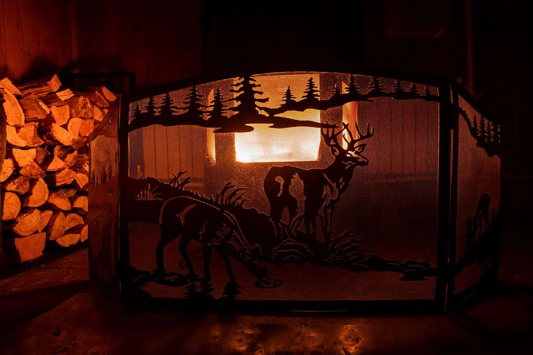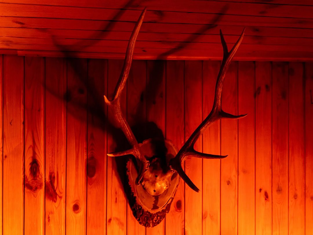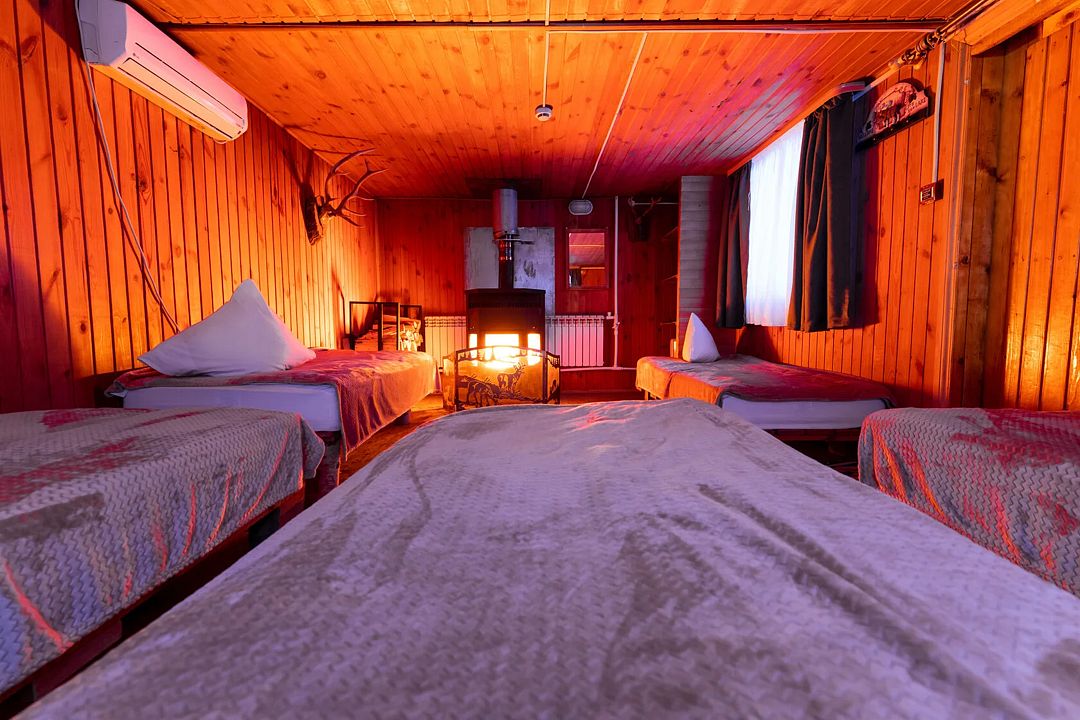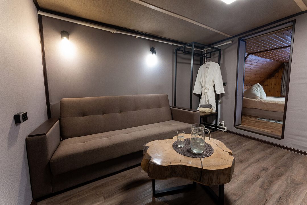Гостиная — это большой рубленый бревенчатый дом вместимостью до 60 человек. Он сделан из огромных бревен в таёжно-охотничьем стиле, украшен шкурами диких зверей.