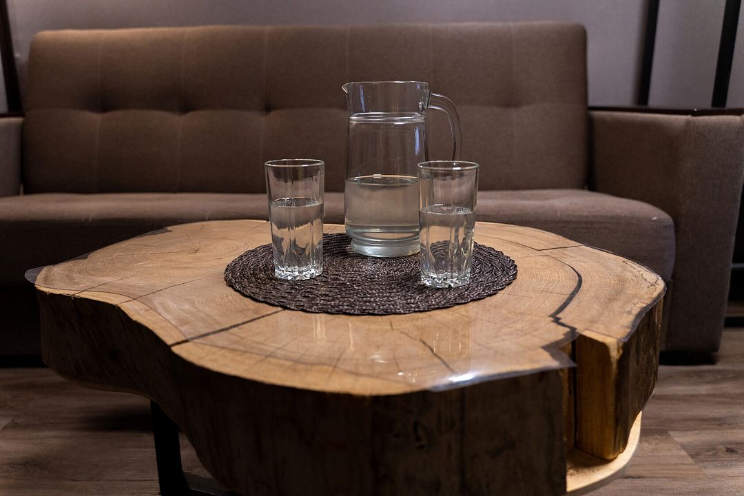 Вся обстановка из натурального дерева. А с балкона открывается шикарный вид на реку.