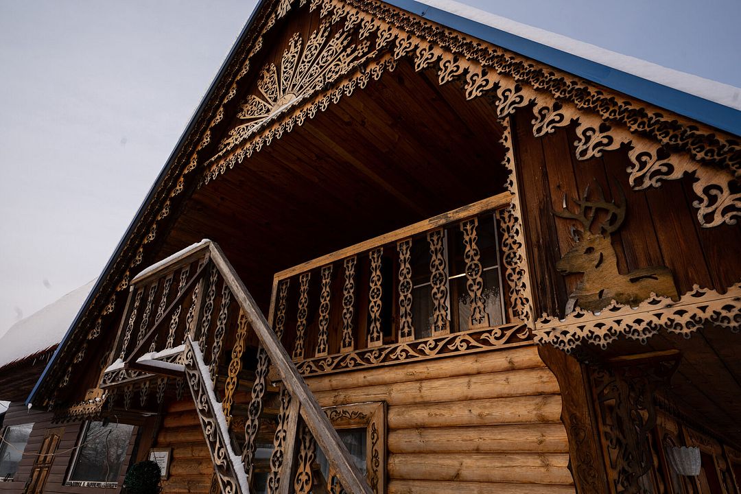 - расположен на втором этаже резного дома;