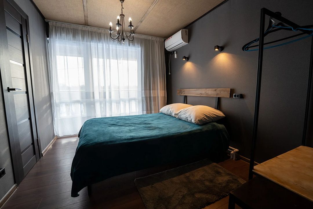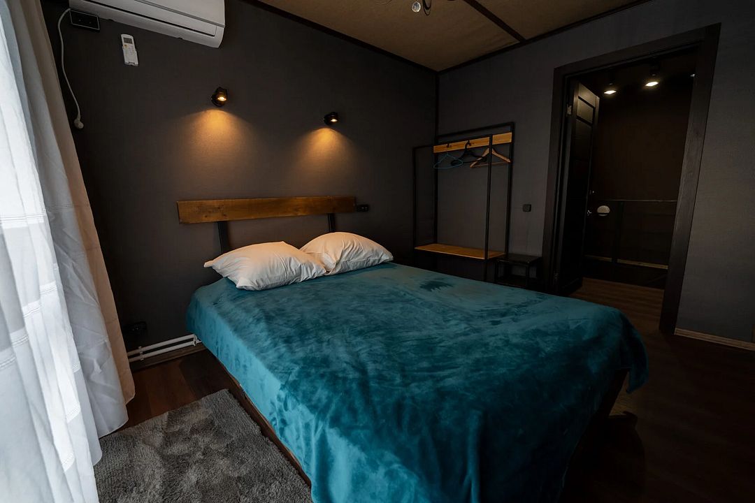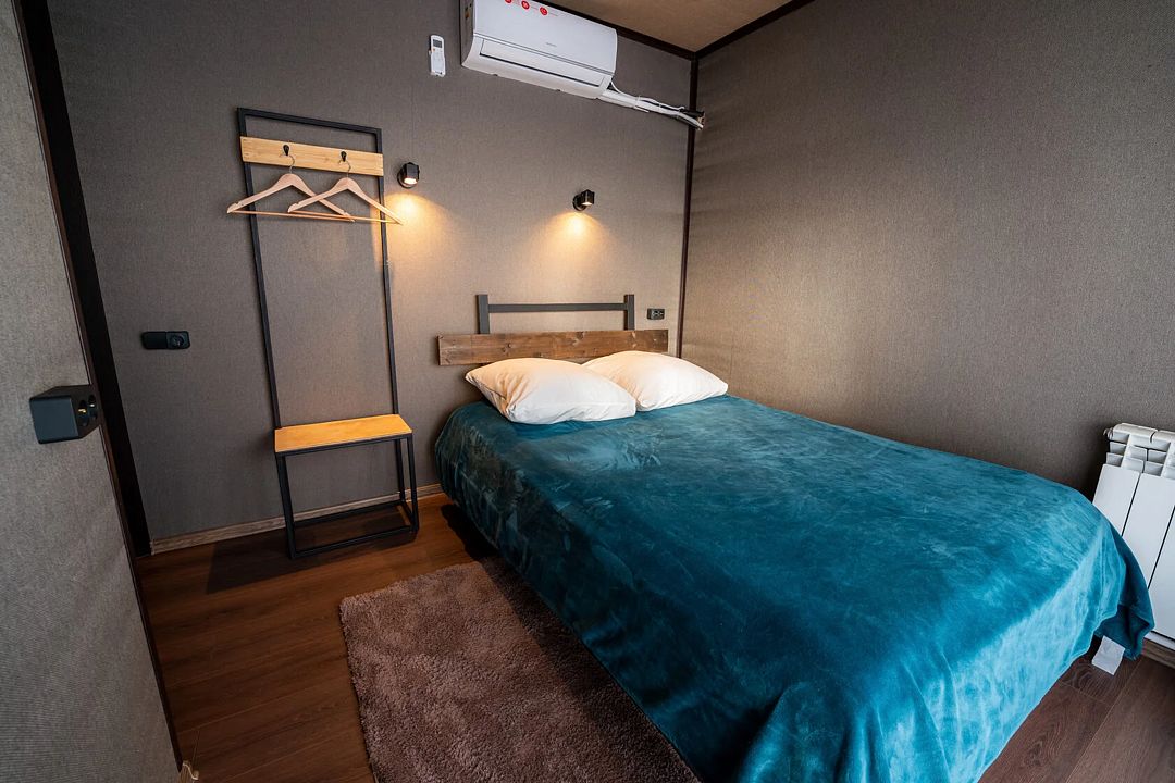 - комната с двуспальной кроватью, стеллаж, санузел, кондиционер, панорамные окна с выходом на террасу — 2 чел.;