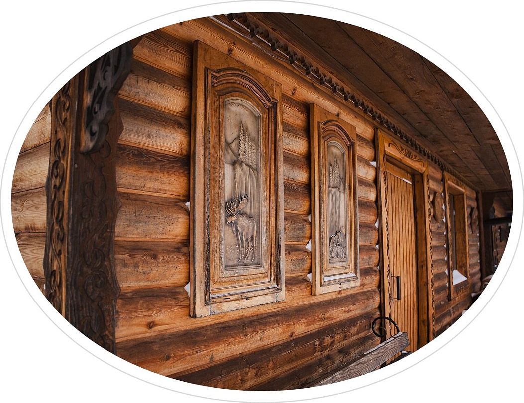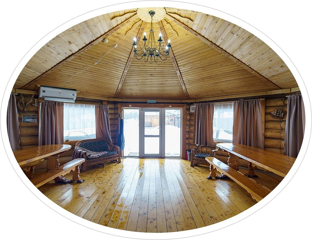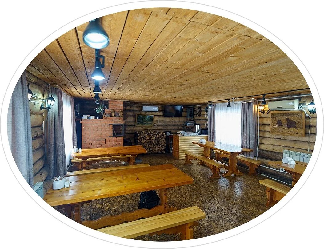 Читать полностьюГостиная — это большой рубленый бревенчатый дом вместимостью до 60 человек. Он сделан из огромных бревен в таёжно-охотничьем стиле, украшен шкурами диких зверей.