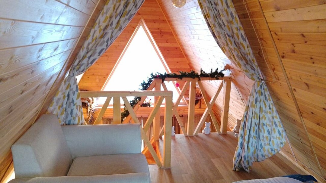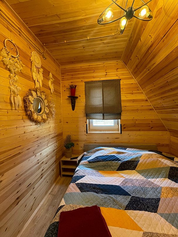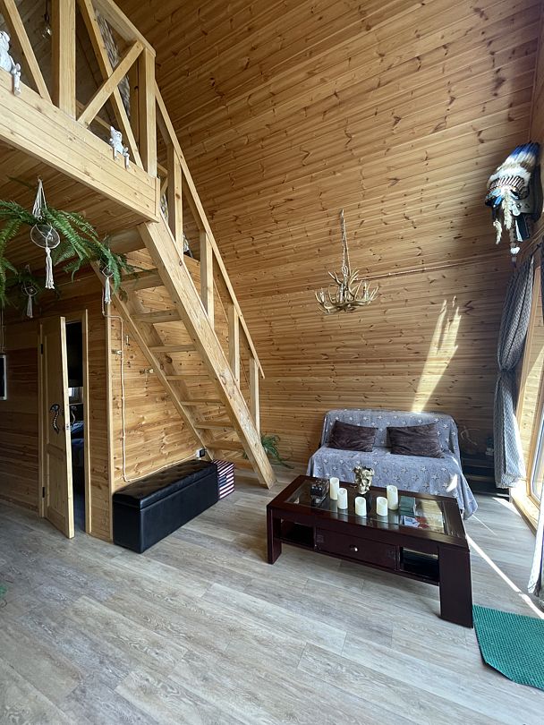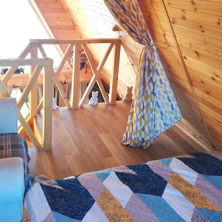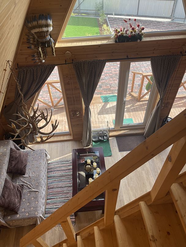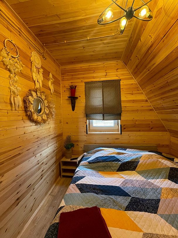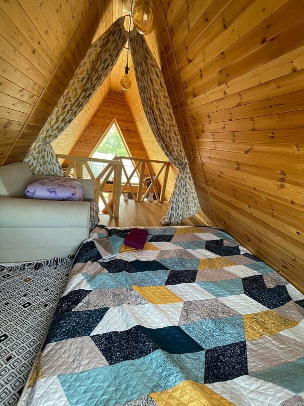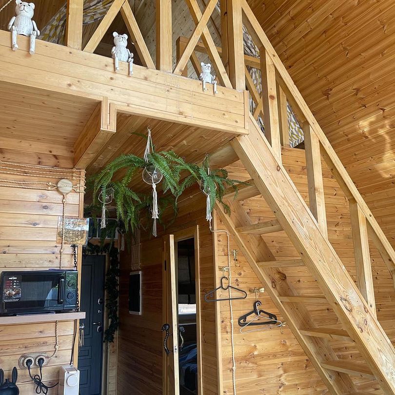 На второй этаж ведет удобная лестница с перилами, где гостей ждет огромное двуспальное место размером 220х220 и кресло для чтения. Для гостей предоставляется мягкая постель и банные халаты.