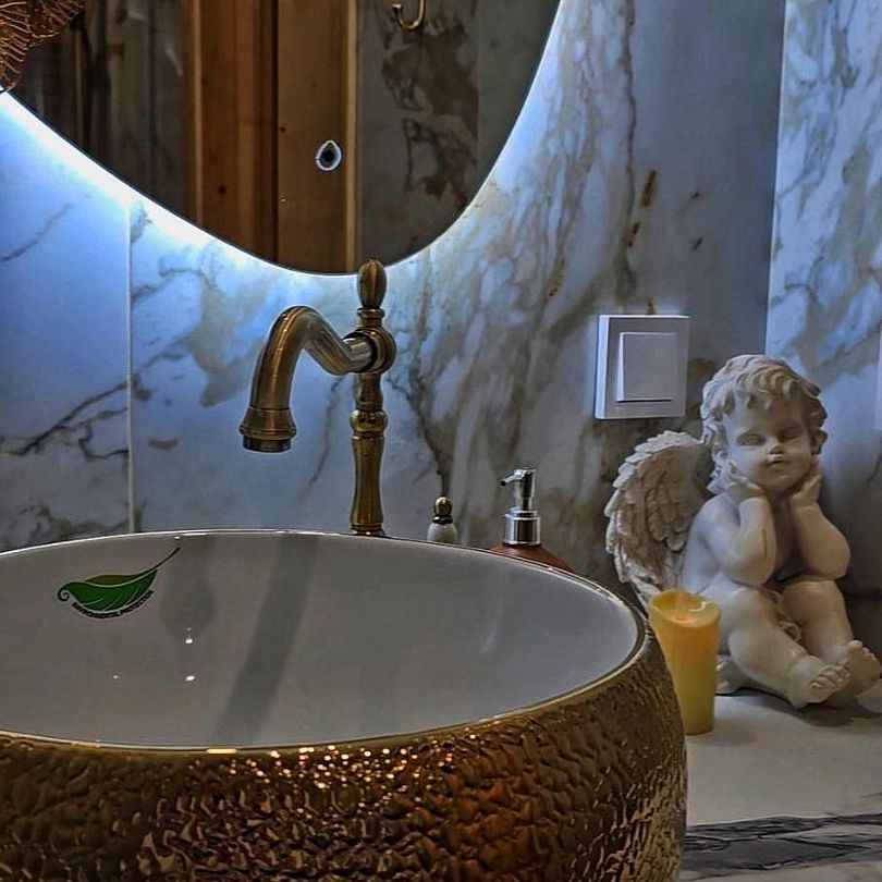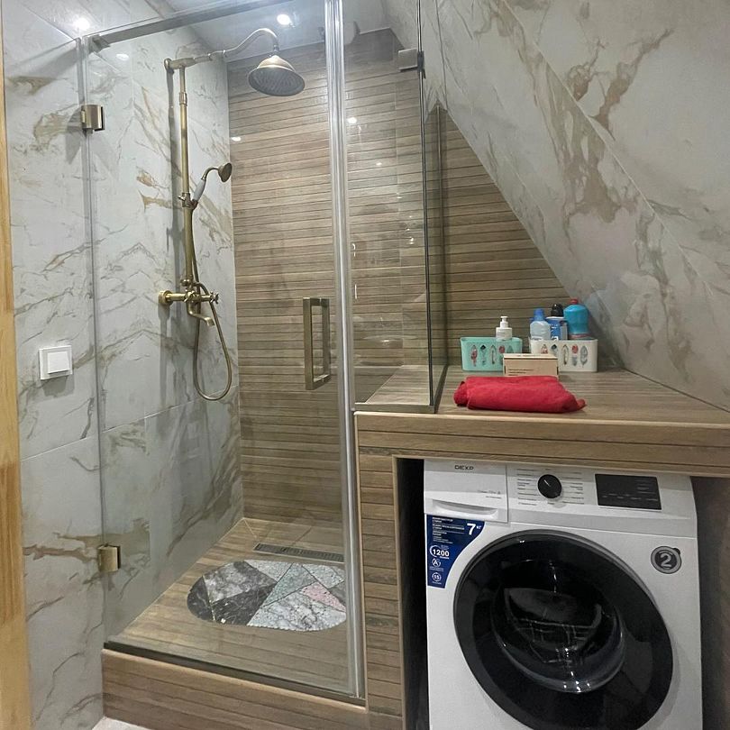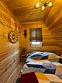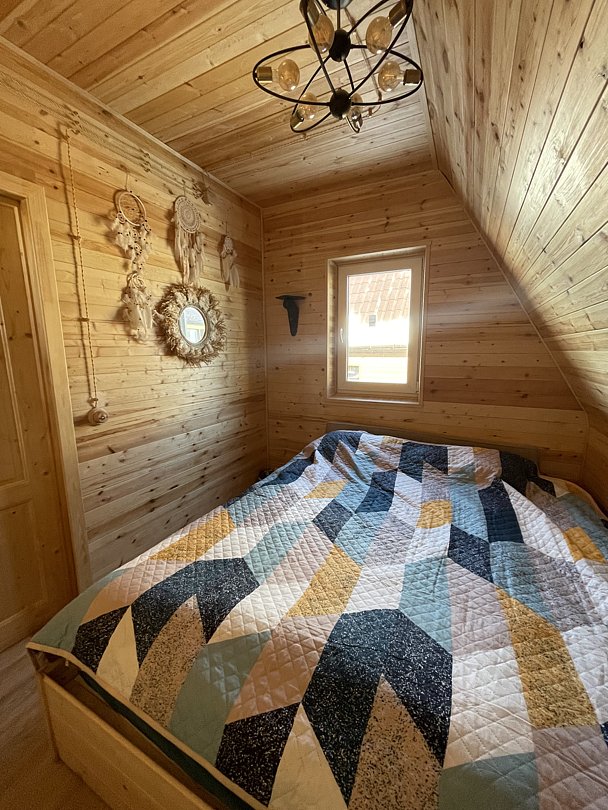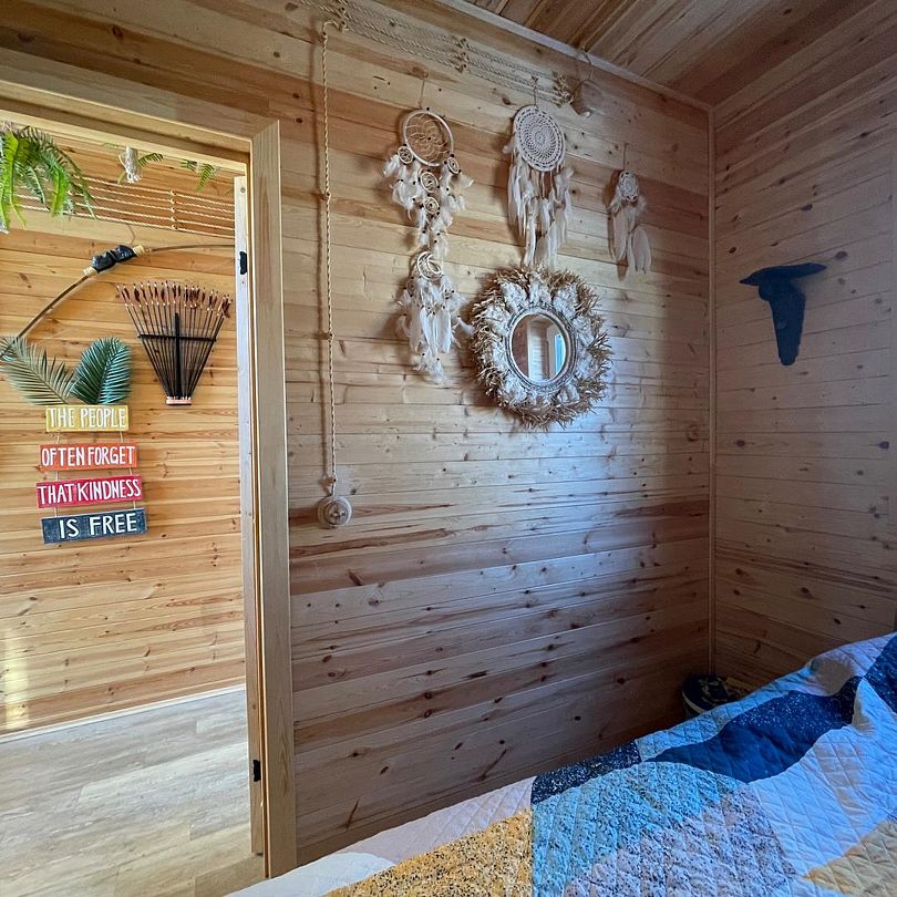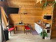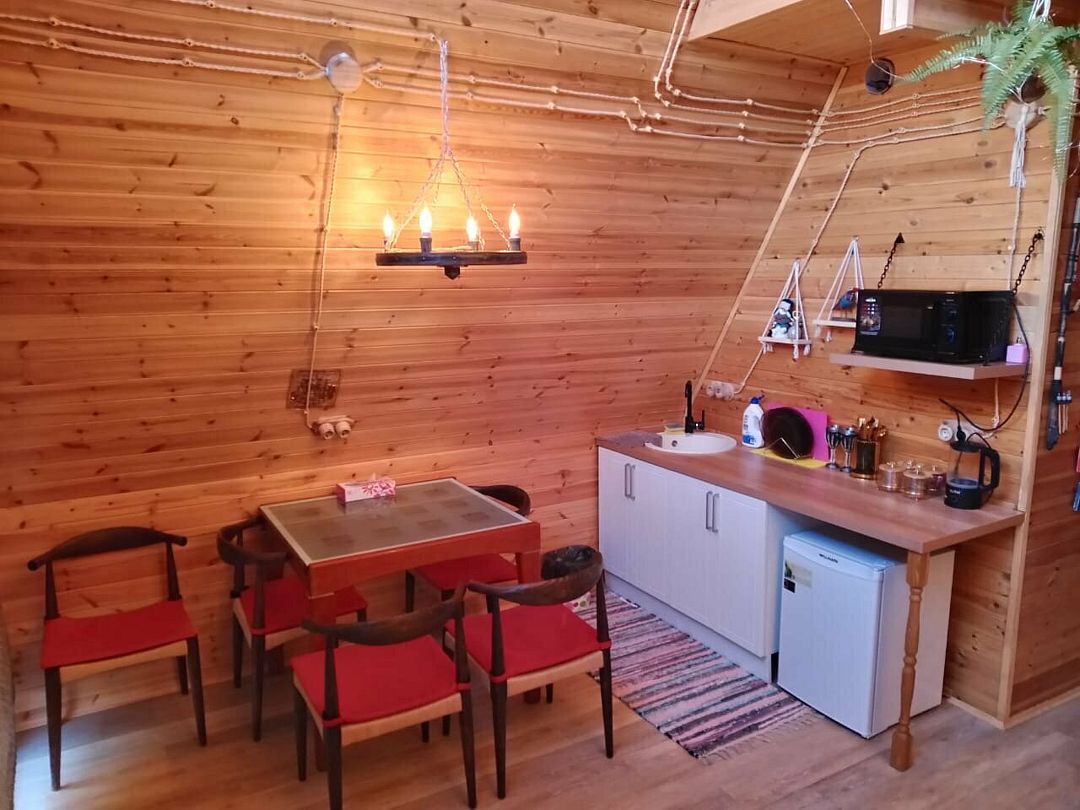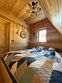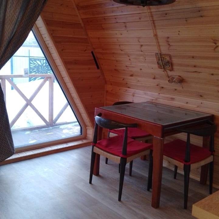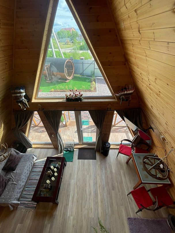 На второй этаж ведет удобная лестница с перилами, где гостей ждет огромное двуспальное место размером 220х220 и кресло для чтения. Для гостей предоставляется мягкая постель и банные халаты.