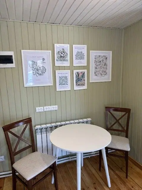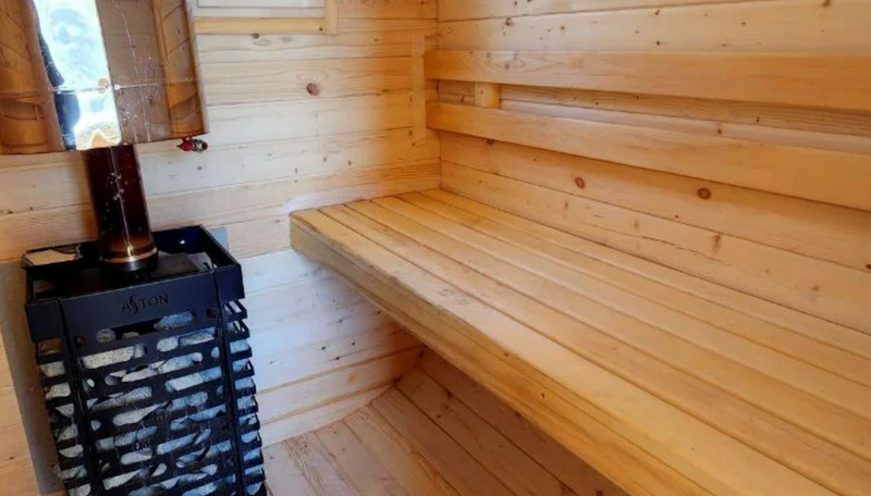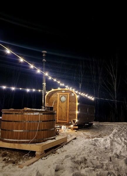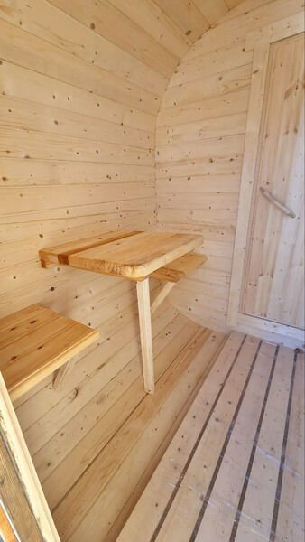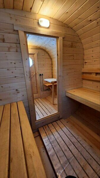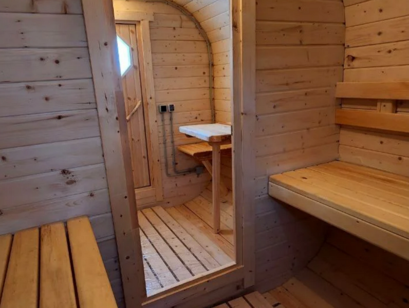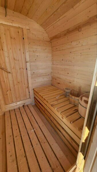 Вместимость бани-бочки 2-3 человека. В бане небольшая парная и комната отдыха.
