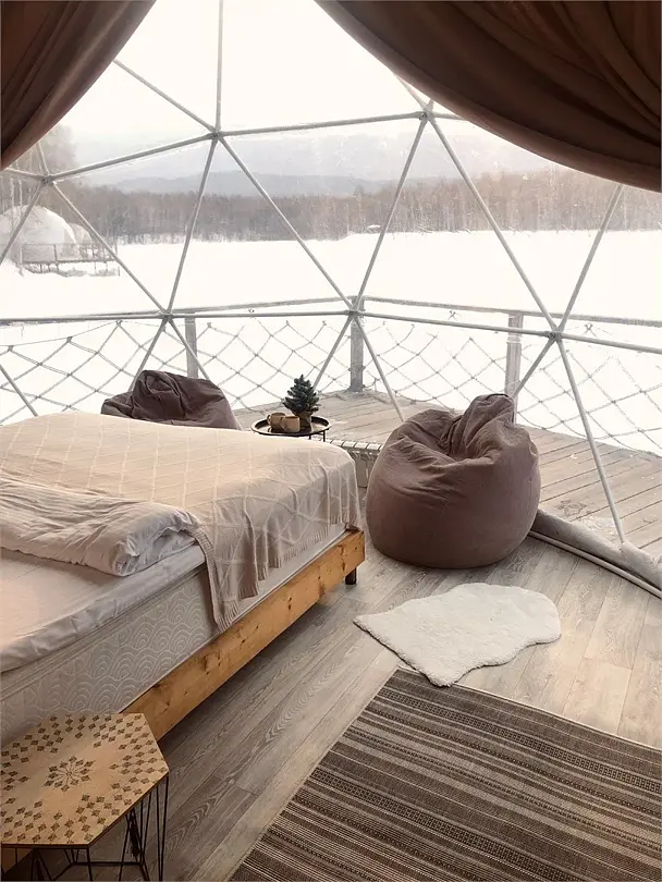 Глэмпинг работает круглогодично. Для размещения предусмотрено 4 шатра – Махаон, Хехцир, Лотос и Бархат. Гостей ждет атмосфера уединения в дикой природе, имея при этом все удобства. Номера укомплектованы необходимой мебелью, теплыми полами, есть чайник, санузел с умывальником и туалетом.