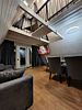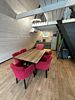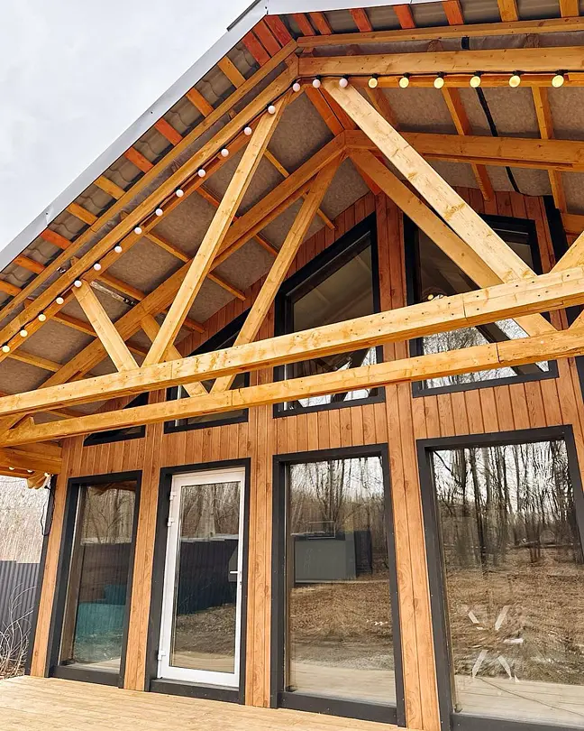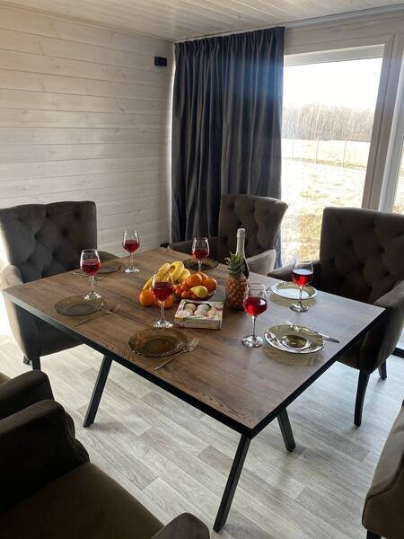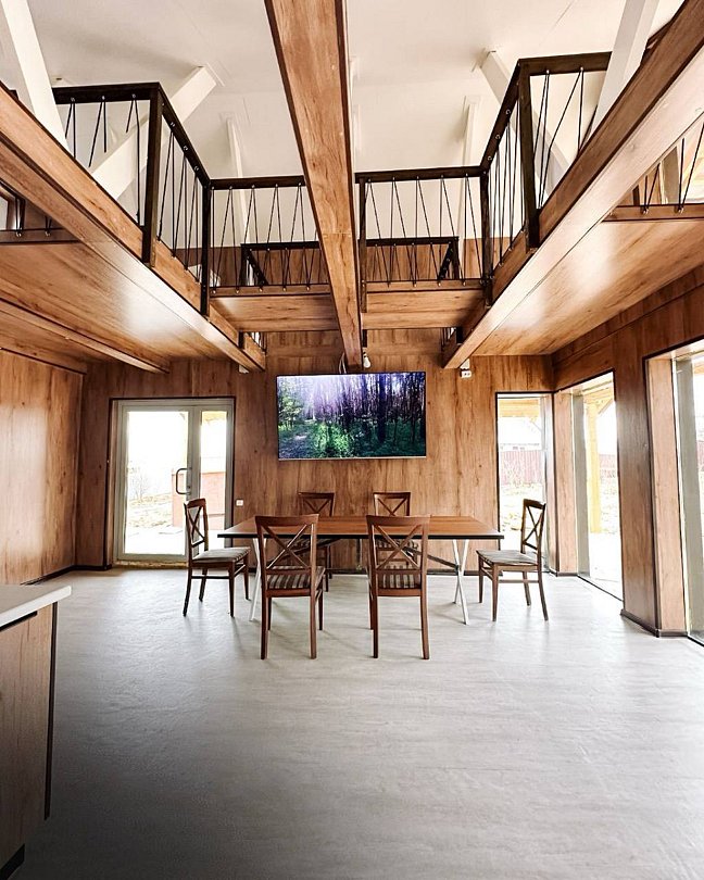 Шикарный большой дом с панорамными окнами, открывающими завораживающий вид на лес, и просторной террасой — идеальное место для отдыха! Внутри гостей ждут два больших стола, уютный раскладной диван, плазменный телевизор и спальное место для двоих на втором этаже.