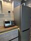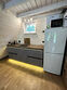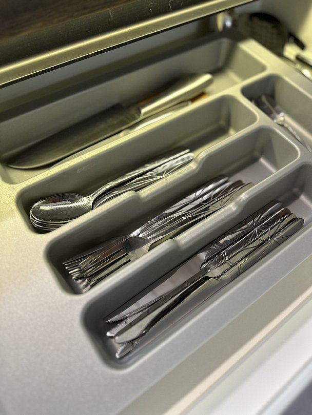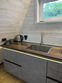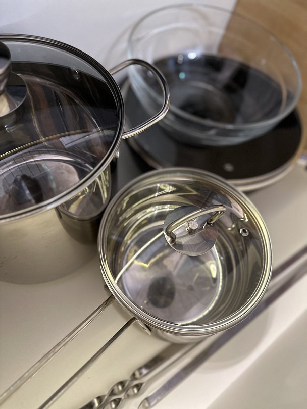 Кухня оборудована чайником, холодильником, микроволновой печью и индукционной плитой, а также всей необходимой посудой: тарелками, кружками, столовыми приборами и посудой для приготовления еды.