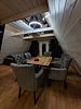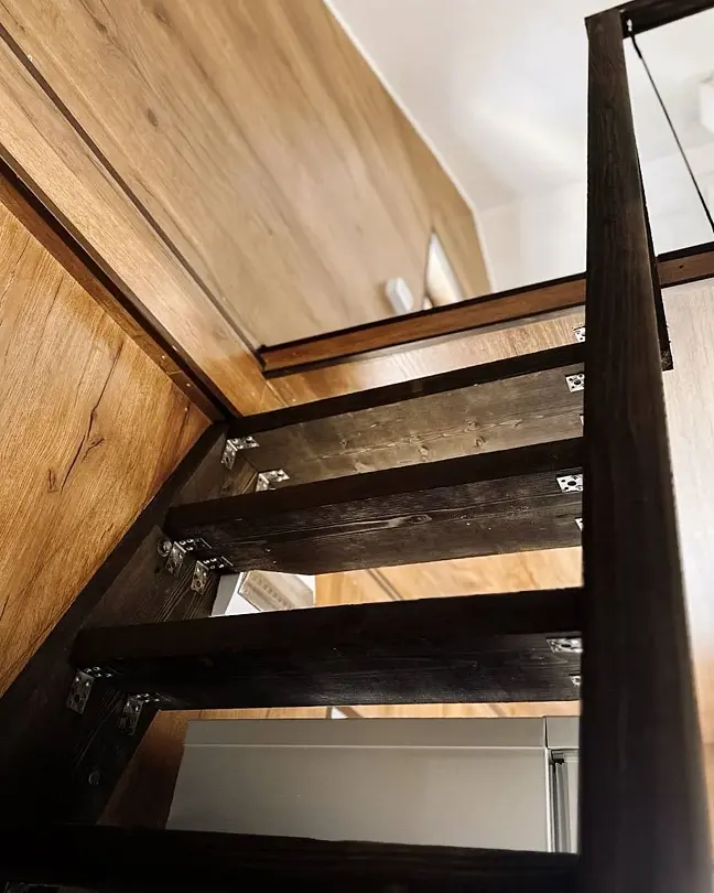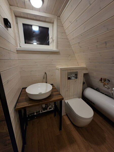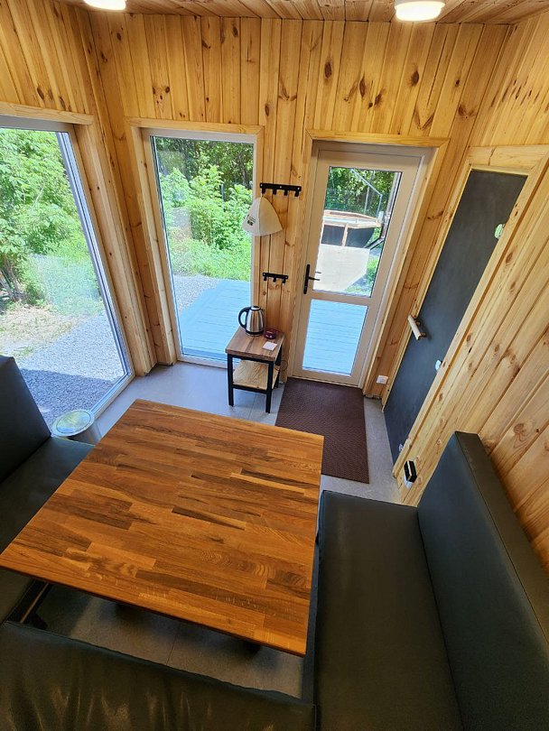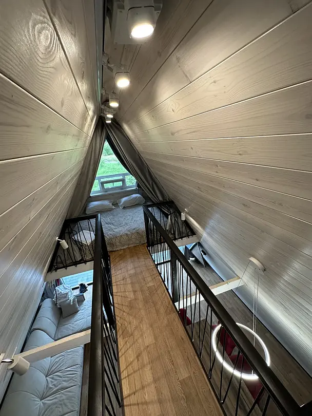 На первом этаже домика расположены современная кухня с обеденным столом, ванная комната с туалетом, телевизор и раскладной диван, который легко превращается в дополнительное двуспальное место. На втором этаже вас ждут два двуспальных места.
