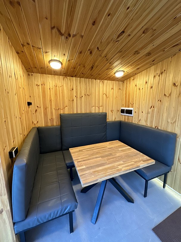 VIP-домик — это уютное пространство для вашего отдыха. На первом этаже расположены современная кухня с обеденным столом, телевизор и раскладной диван, который легко превращается в дополнительное двуспальное место.