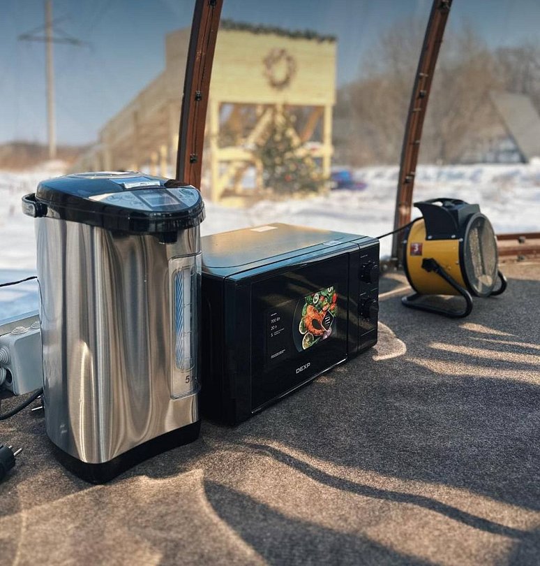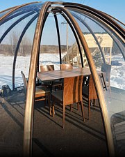 Беседка «Иглу» выполнена в форме купола с прозрачными стенами и потолком, что позволяет наслаждаться пейзажами даже в зимний период, поддерживая комфортную температуру внутри на уровне 15–17°С. Дополнительная тепловая пушка обеспечивает уют в любое время года.
