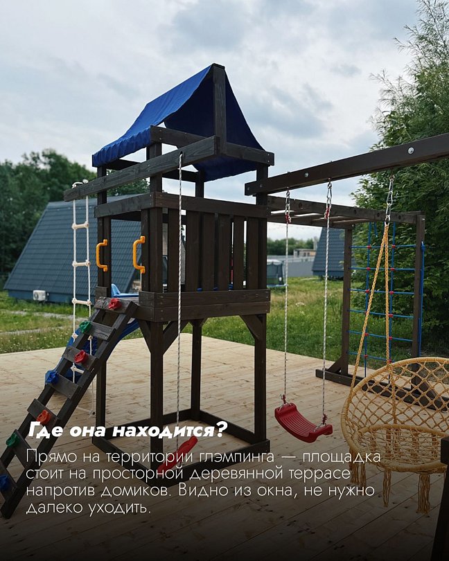 Детская площадка расположена на просторной деревянной террасе, прямо перед домиками глэмпинга, что позволяет родителям легко присматривать за детьми, не отходя далеко от домиков. Площадка оборудована качелями, горкой и разнообразными лазательными элементами, обеспечивая детям активный отдых и радость от игр.