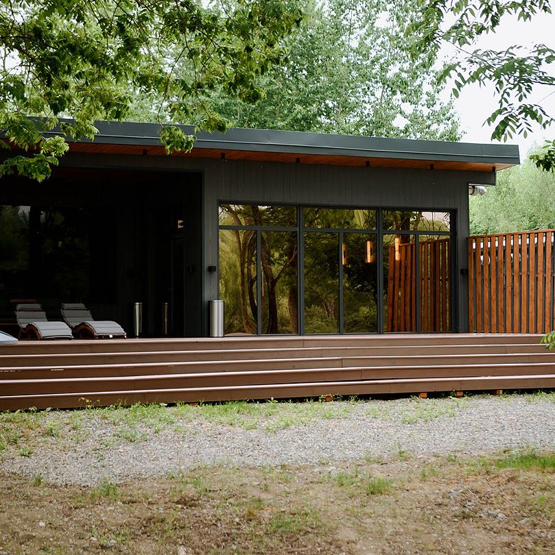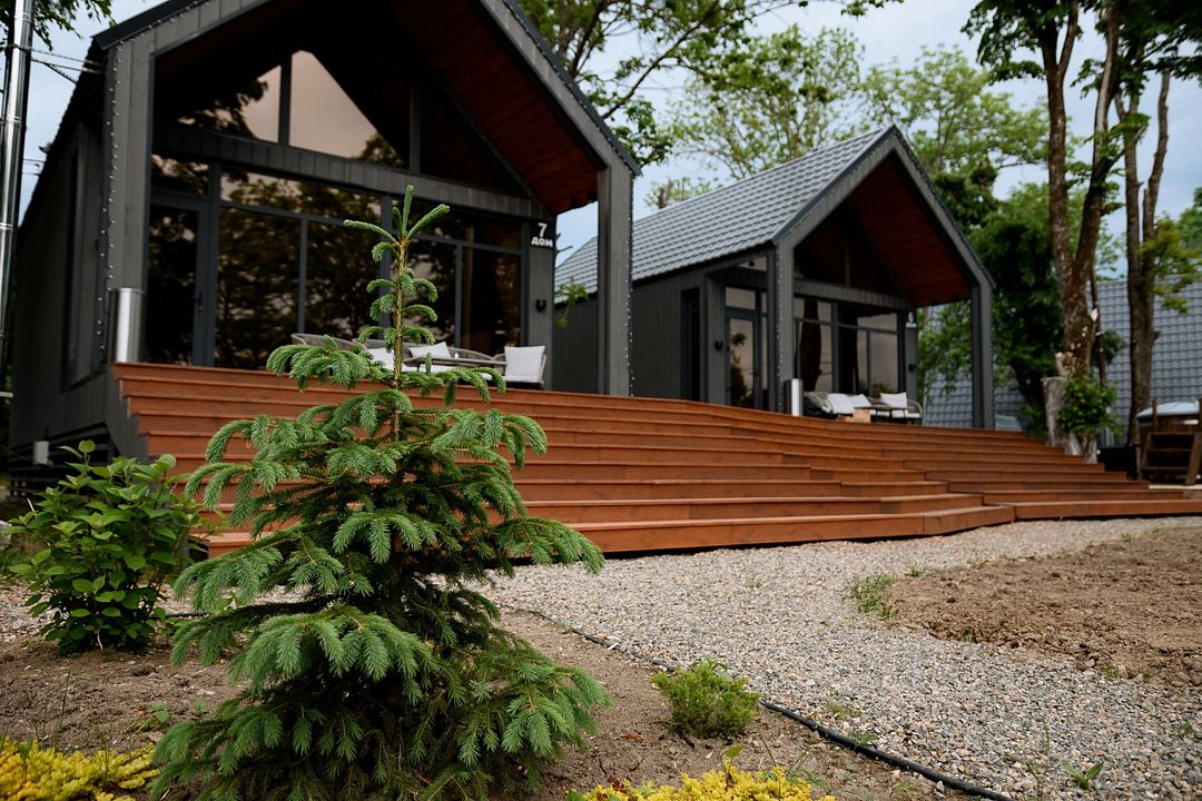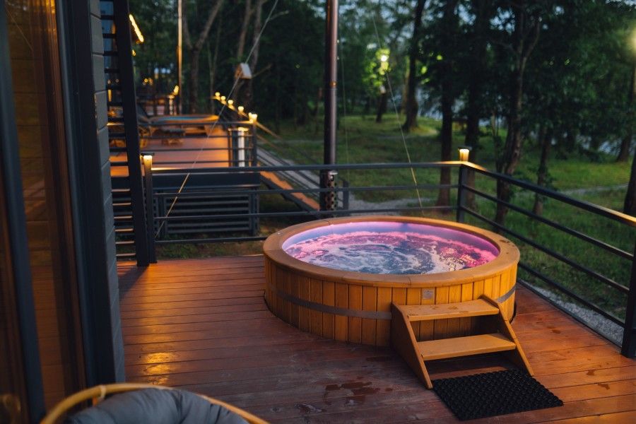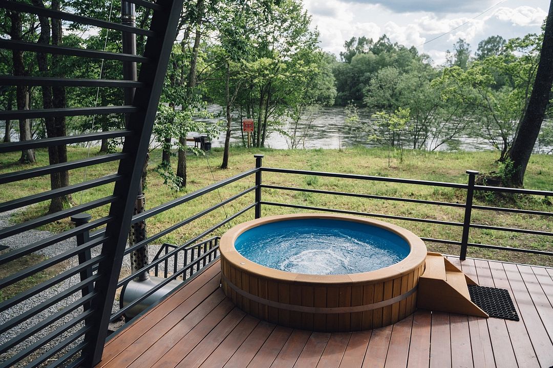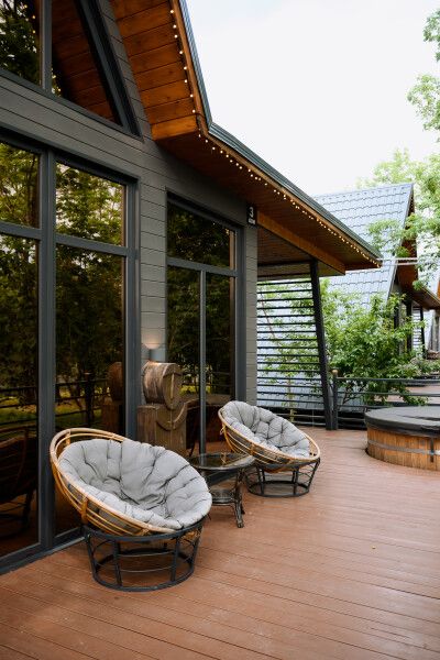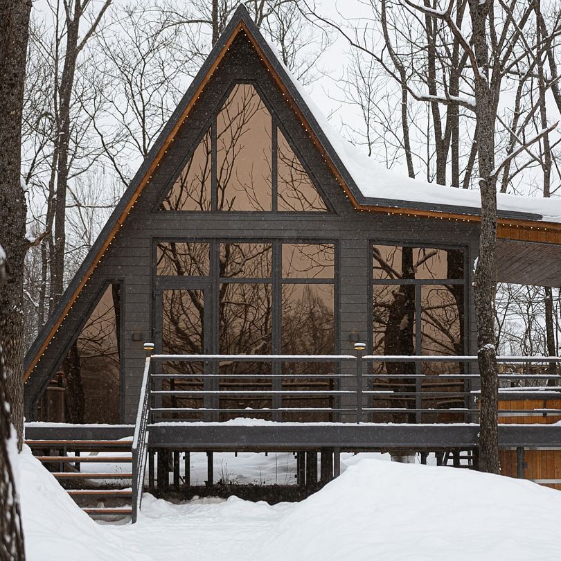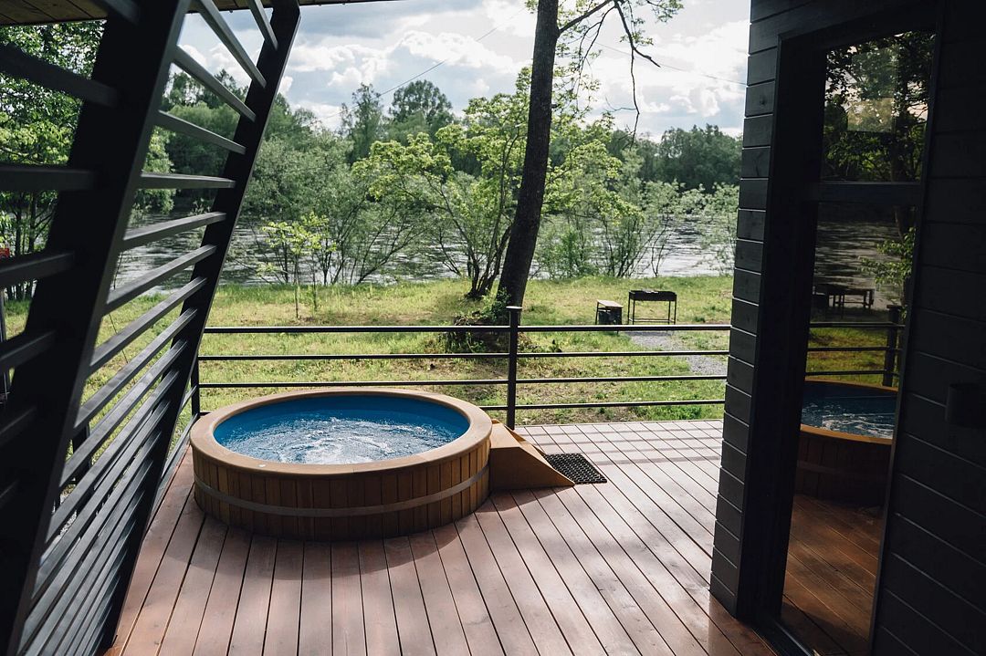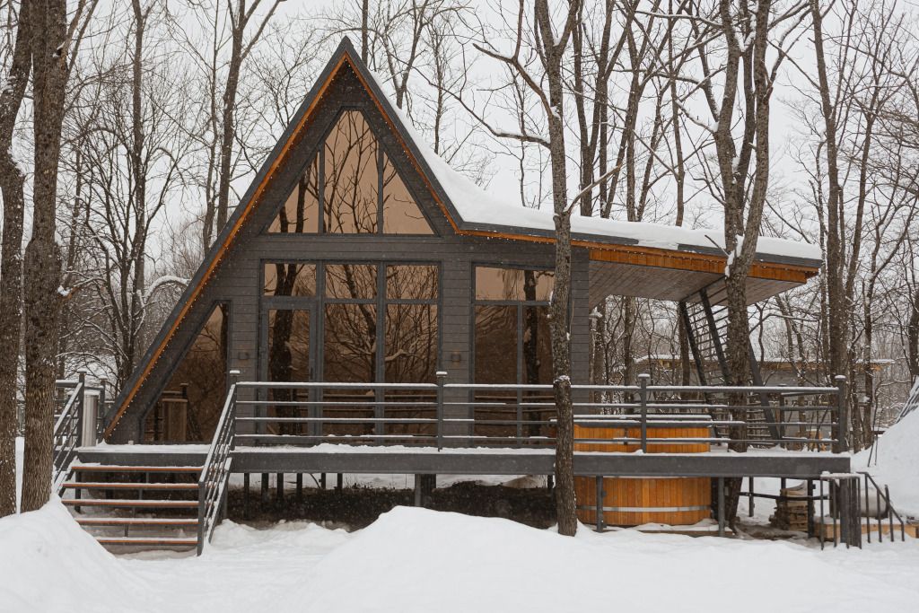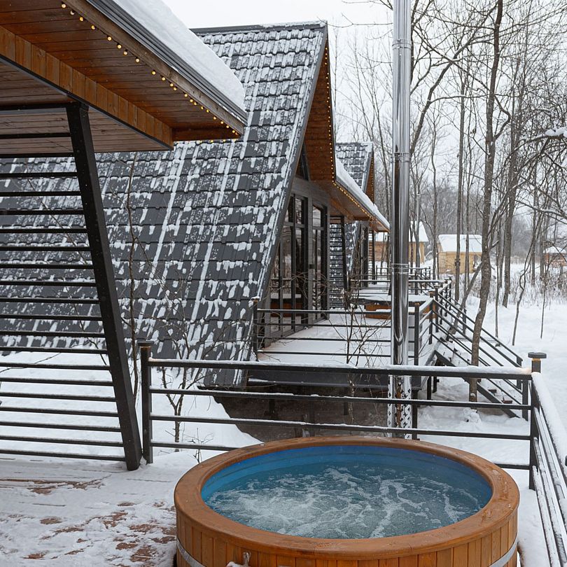 На террасе каждого дома в стиле A-frame расположен банный чан, согреваемый дровяной печью. Это не просто место для водных процедур, а настоящая парная под открытым небом, где можно насладиться теплом и красотой окружающего пейзажа.