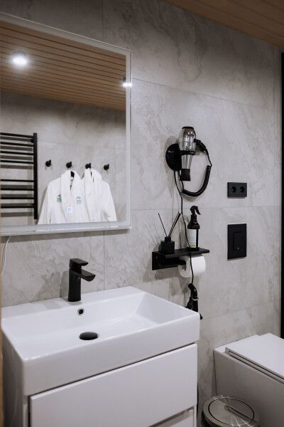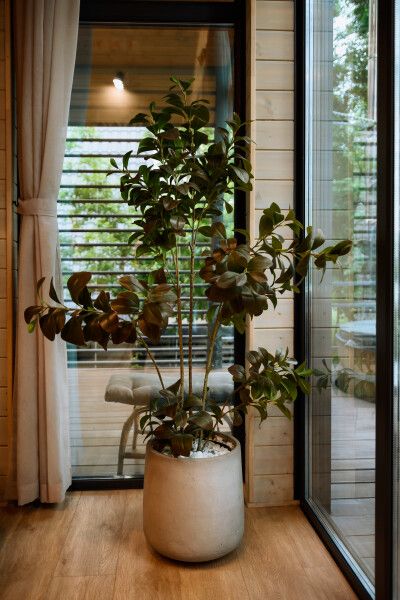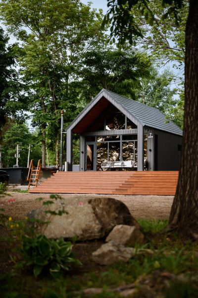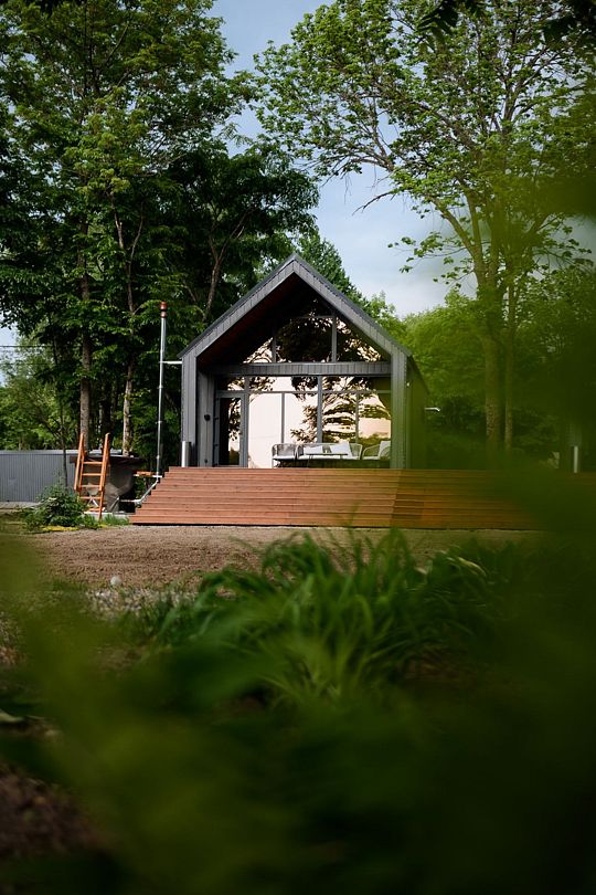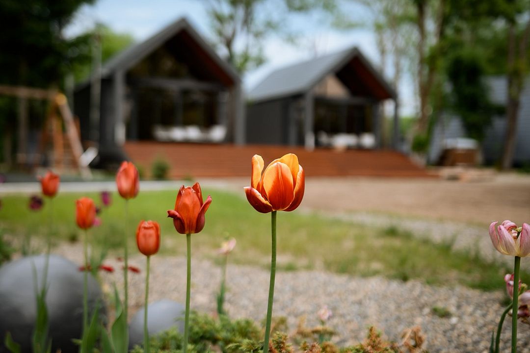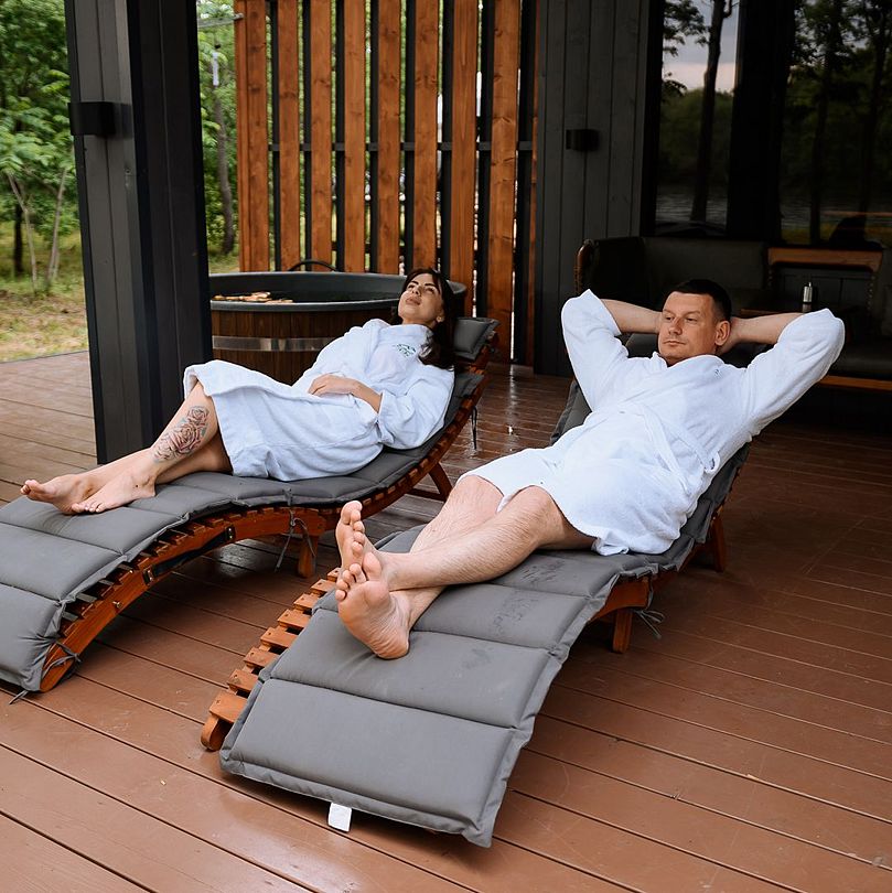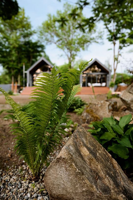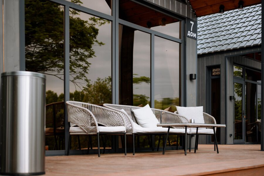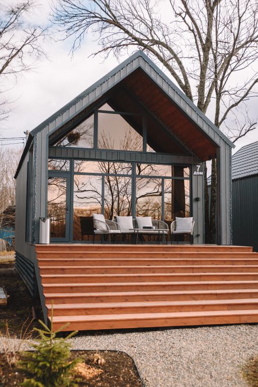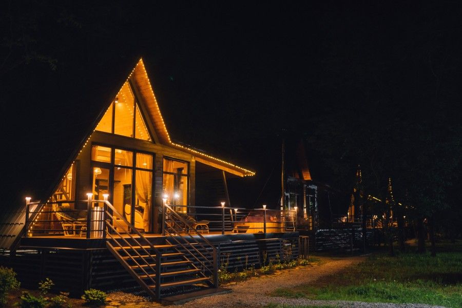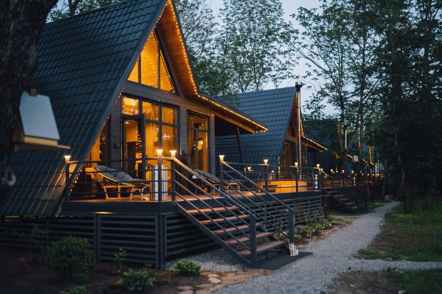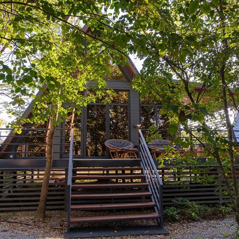 На террасе каждого дома в стиле A-frame расположен банный чан, согреваемый дровяной печью. Это не просто место для водных процедур, а настоящая парная под открытым небом, где можно насладиться теплом и красотой окружающего пейзажа.