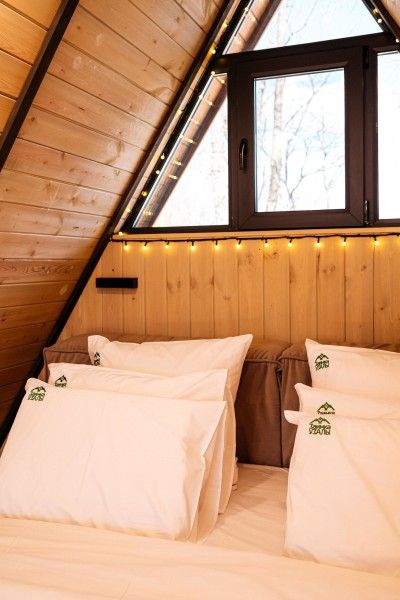 В шатре есть гостиная, обеденная и кухонная зоны, спальня, санузел. Его изюминка – панорамное окно, из которого открывается невероятный вид на лес, телевизор и шторы блэкаут. Чан на террасе бани.
