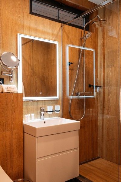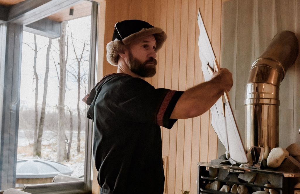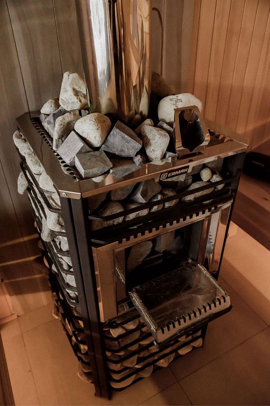 Внутри, с комфортом размещая до четырех гостей, баня предлагает насладиться парением, изысканными угощениями и бодрящим ароматным чаем. Дополнительно гостям предлагаются шапки и веники из пихты или дуба.