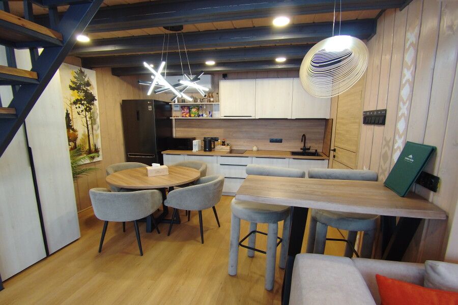 В доме есть гостиная, обеденная и кухонная зоны, спальня, санузел. Особенности барнхауса — барная стойка, гамак и массажное кресло. Чан расположен у дома.