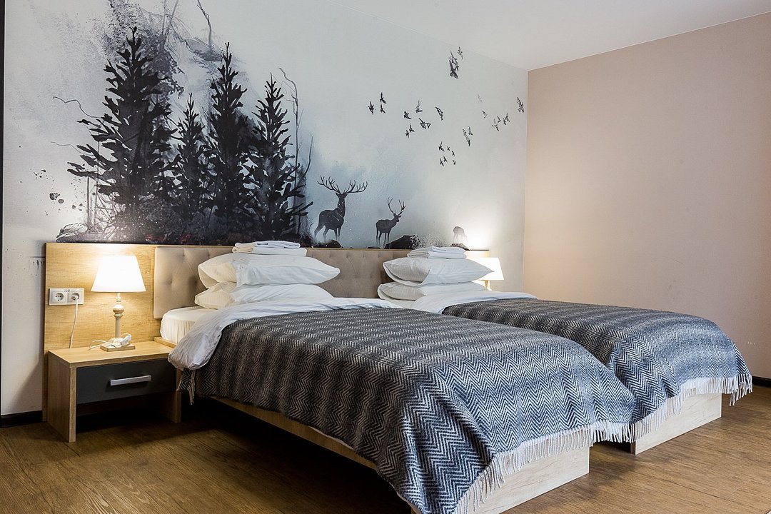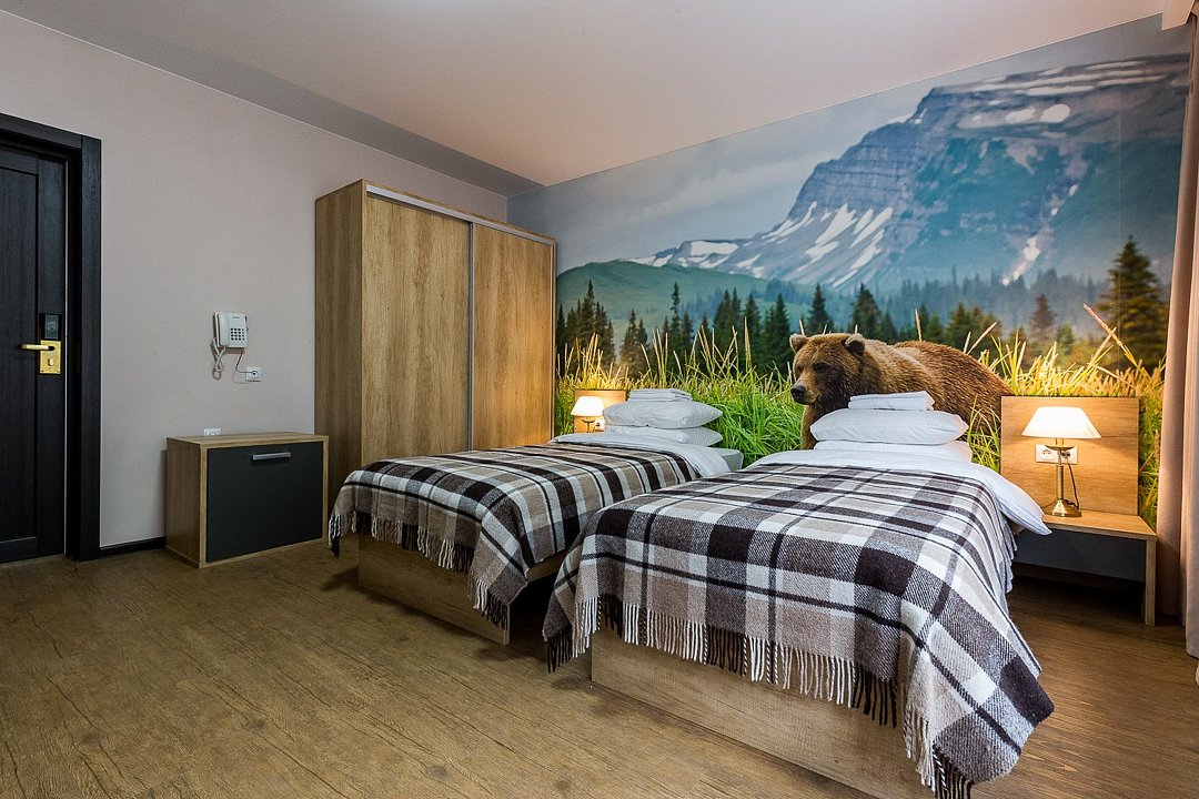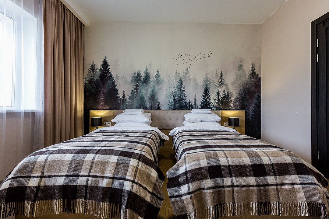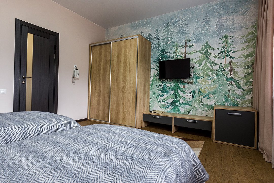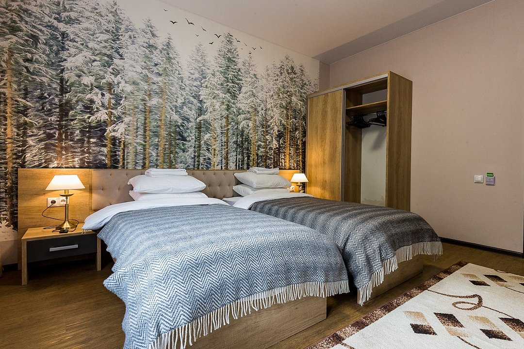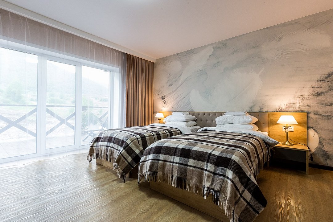 Wi-Fi, светильник, фен, электронные замки, санузел, банные принадлежности, банные полотенца, гигиенические средства, две полутораспальные кровати, кресла, тумбы, шкаф для одежды, вешалки, унитаз, душ, вид на реку, стол, тумба, туалетные средства, туалет, цифровое тв, внутренний телефон, телевизор с плоским экраном, мини-холодильник, шкаф-купе, вид на горы, вид на лесВ гостиничном номере