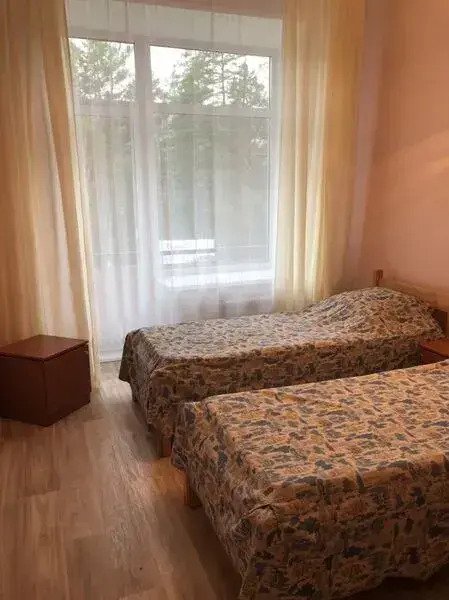 В номере: две односпальные кровати, плательный шкаф, тумбочки, телевизор, 2 стула. Душ и туалет в номере.