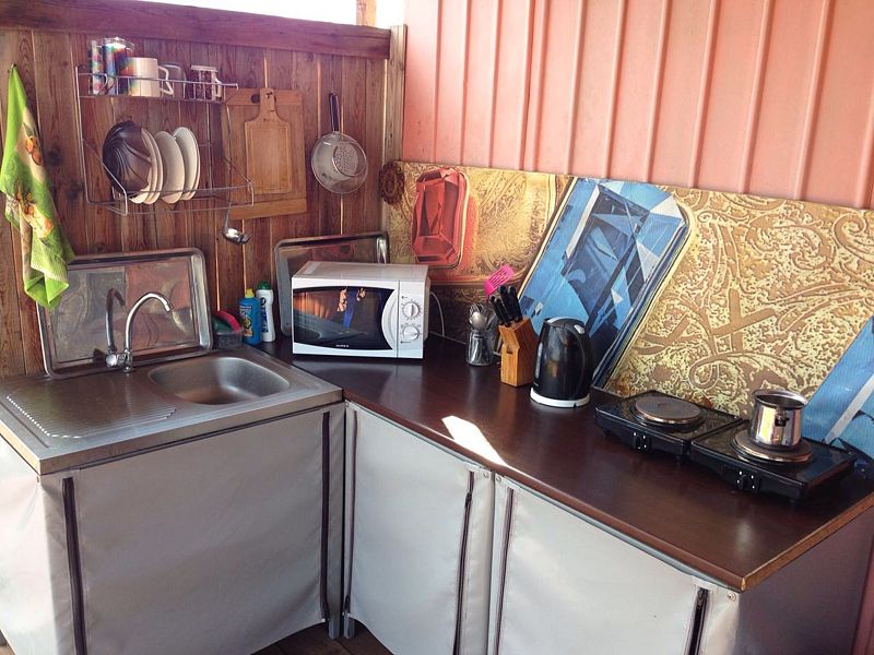 летняя кухня: проточная вода, микроволновая печь, чайники, электрическая плита, индукционная плита.