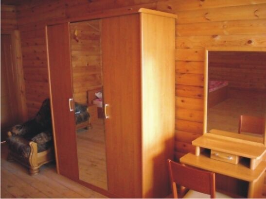 - В спальне — двухспальная кровать, шкаф, трюмо, кресло.