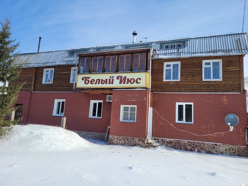 Гостевой дом «Белый Июс», находится на возвышенности, всего в 15-20 метрах от реки. Здание расположено на выезде из деревни на участке площадью 50 соток, который окружен металлическим забором с распашными железными воротами. Вся территория перед гостевым домом представляет забетонированную парковку на 20 машин.