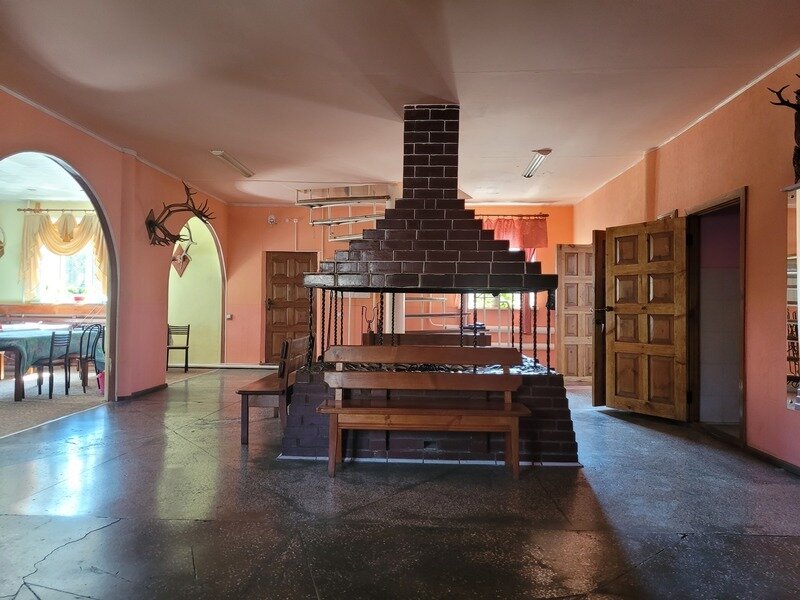 Дом состоит из двух этажей и жилой мансарды, общая площадь составляет 571 квадратный метр. На первом этаже находятся холл, столовая с мини-баром и мебелью (столы, стулья), камин с открытым очагом, оснащенный вытяжкой. Кроме того, на первом этаже расположена кухня с кухонным оборудованием, металлическими столами, шкафами, электрической и газовой духовыми шкафами, плитой на 4 комфорки, холодильником, морозильной камерой, посудомоечной машиной, мойкой, техникой и посудой. Есть также бильярдная комната с одним столом, административная комната, 2 душевые и 2 туалета.