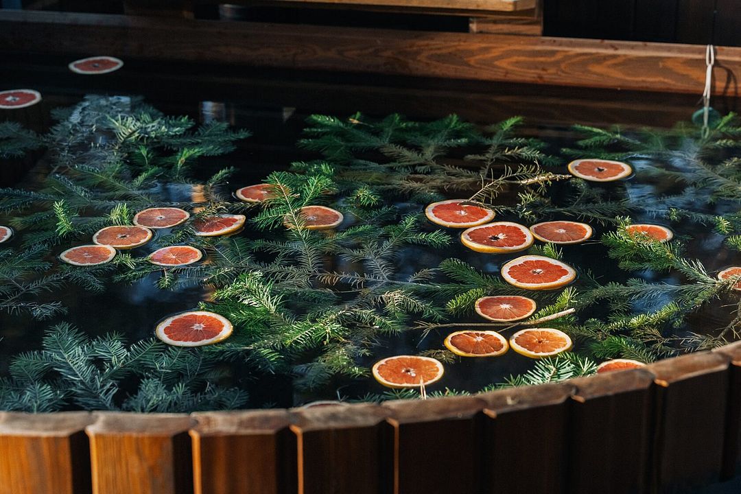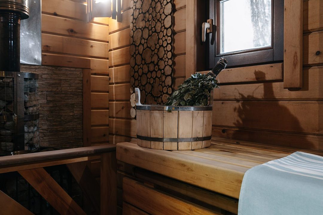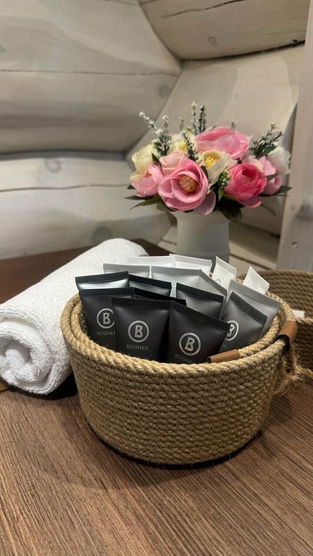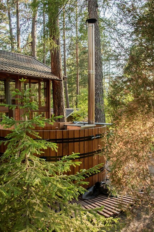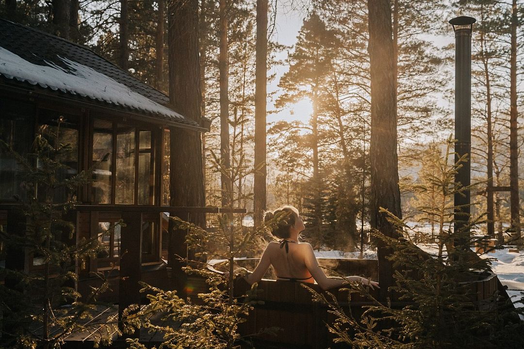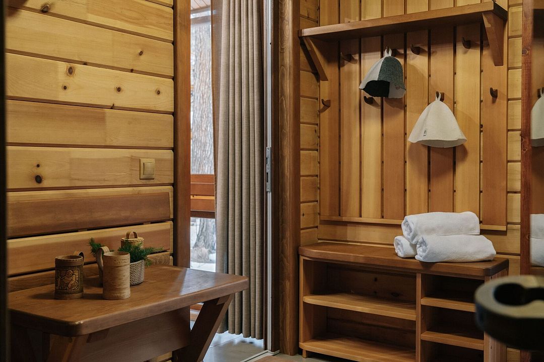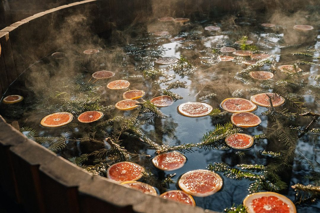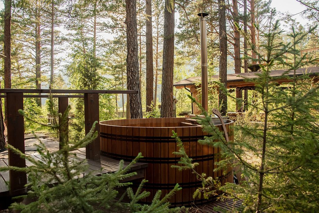 Гости, арендовавшие русскую баню, получают доступ к подогреваемой купели, открывающей великолепные виды на горы и лес. Для создания особой атмосферы предлагается возможность добавить в купель свежую пихту и цитрусовые за дополнительную плату в размере 5000 ₽, что сделает отдых еще более незабываемым.