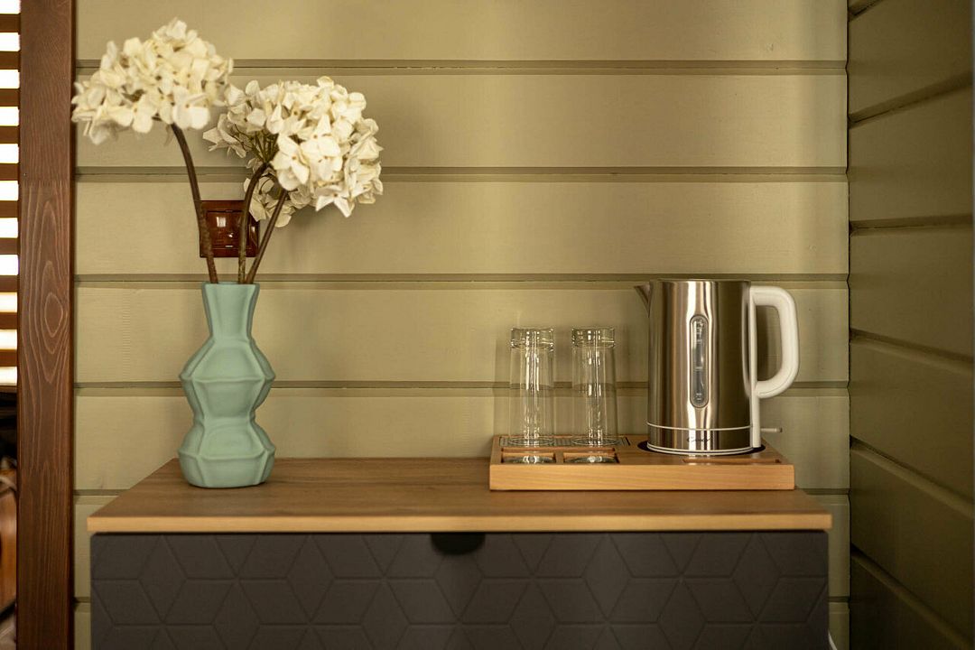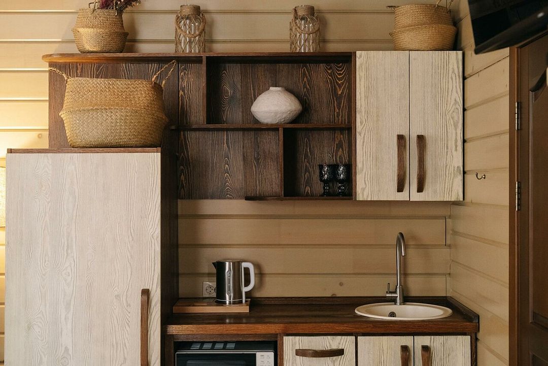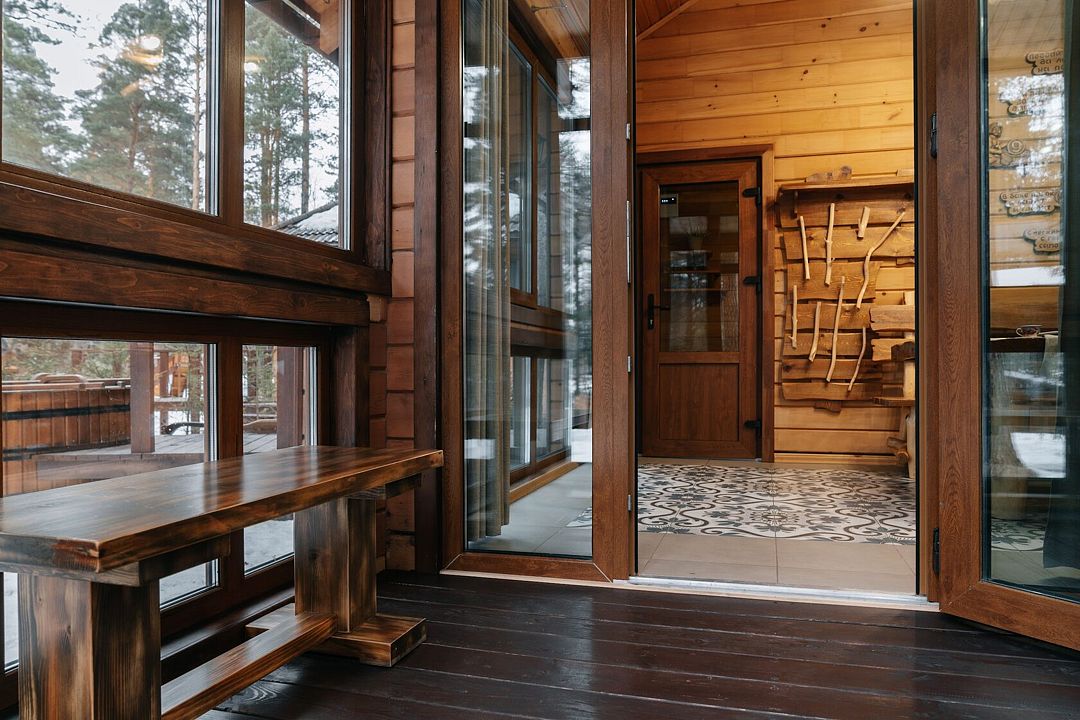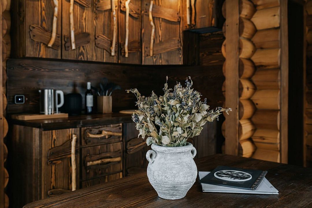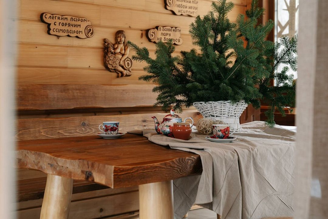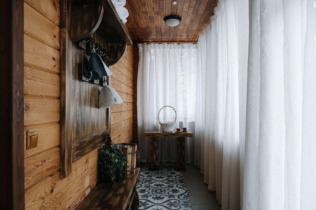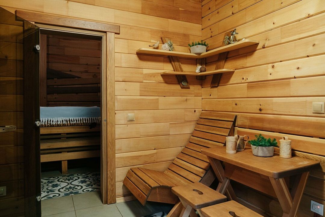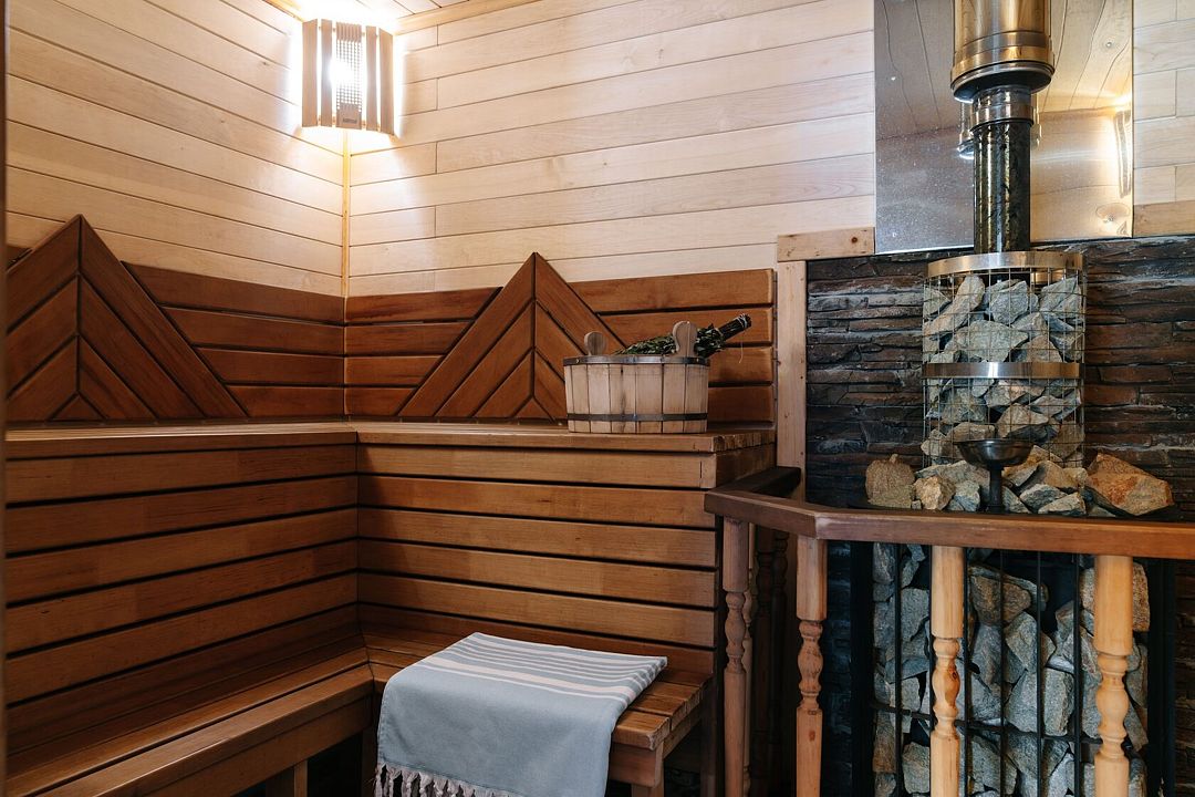 Гости, арендовавшие русскую баню, получают доступ к подогреваемой купели, открывающей великолепные виды на горы и лес. Для создания особой атмосферы предлагается возможность добавить в купель свежую пихту и цитрусовые за дополнительную плату в размере 5000 ₽, что сделает отдых еще более незабываемым.