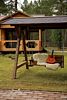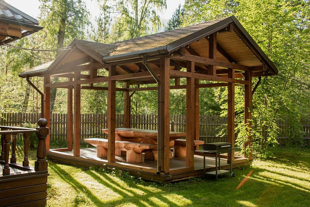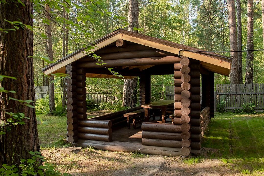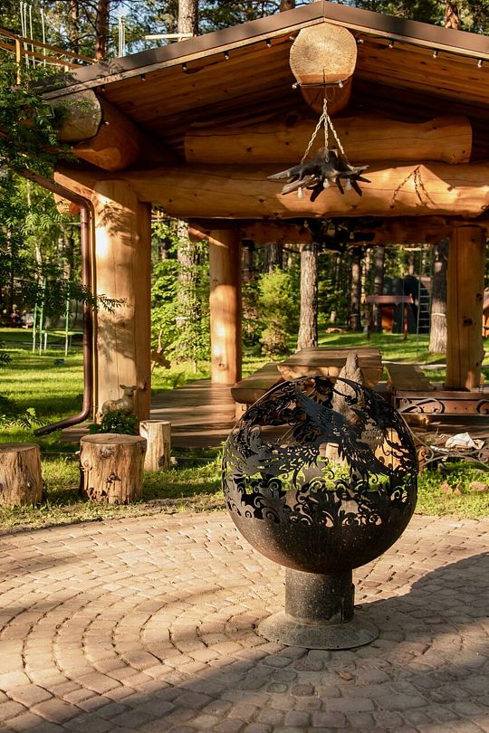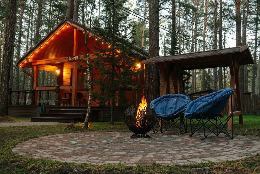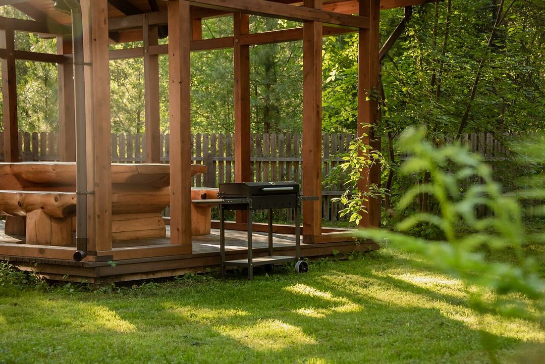 Гостей встречает уютная беседка, оснащенная костровищем и мангалом. Это идеальное место для вечернего отдыха, где можно расслабиться в кругу единомышленников и насладиться душевными беседами под звездным небом.