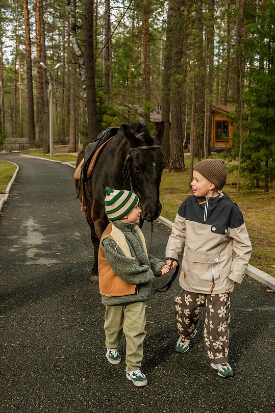 На территории парк-отеля расположена конюшня, где гости могут познакомиться с величественным вороным жеребцом по кличке Черный и милым золотистым пони Танцором. Это удивительное место дарит возможность не только пообщаться с животными, но и насладиться атмосферой тепла и дружбы с четырехногими обитателями.