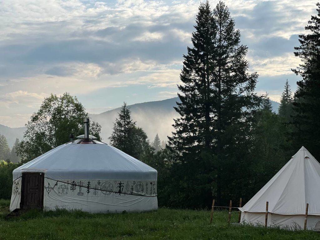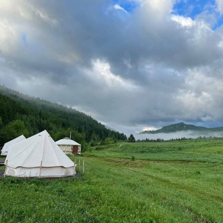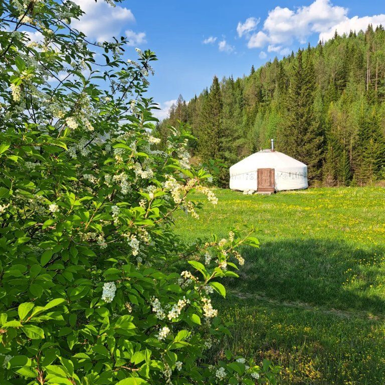 Здесь ценится спокойный отдых без шумных развлечений и музыки. Уютные юрты и шатры оборудованы всем необходимым. Укрытые от посторонних глаз баня и купель расположены на берегу ручья. Есть зона для приготовления пищи с посудой. Питание также можно заказать на месте.