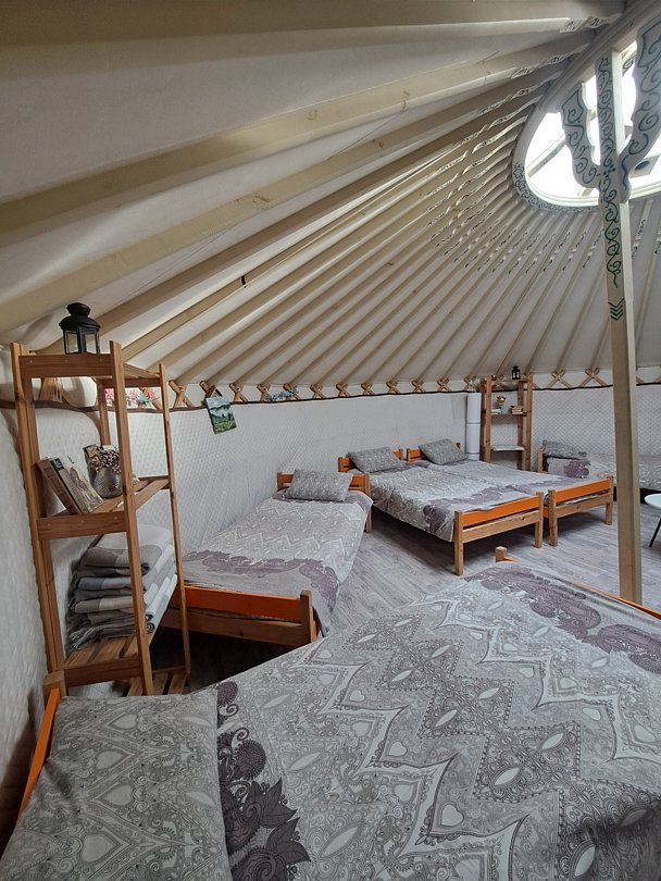 Юрта отлично подойдет для большой семьи или небольшой сборной группы так как в ней расположено шесть 1сп кроватей. Насладитесь необычной атмосфрой, игрой огня в печке и звездным небом которое видно через прозрачный купол юрты.