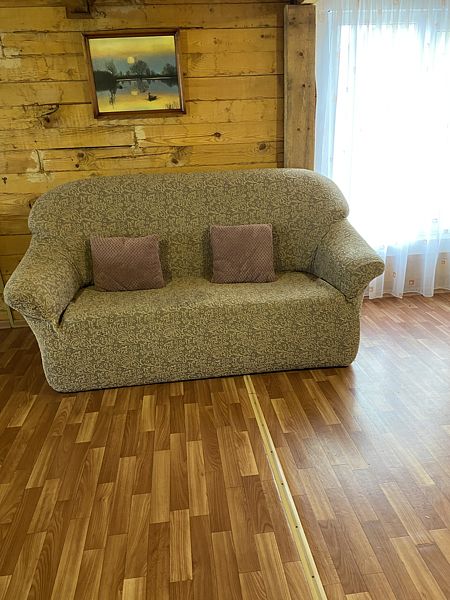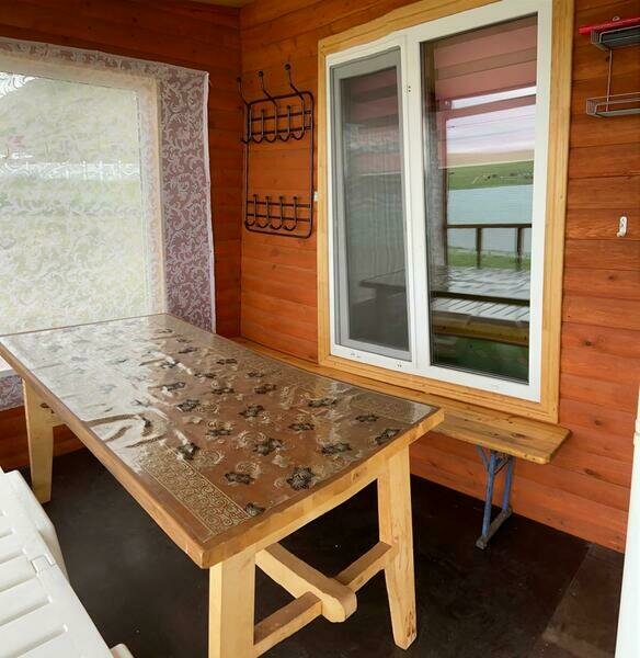 Отдельностоящий на огороженной территории, трехместный полностью благоустроенный дом на озере Тус. Дом с закрытой террасой на которой стоит большой стол, холодильник, эл. плита.