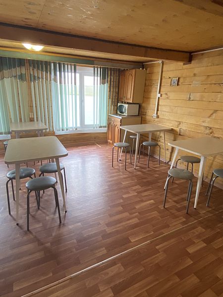 Общая кухня-столовая и общие два сан.узла. Сан. узлы благоустроенные (унитазы, раковины с горячей и холодной водой). На кухне-столовой есть холодильники, электроплитки, электрочайники, газовая плитка, посуда а так же столы и стулья для приема пищи.