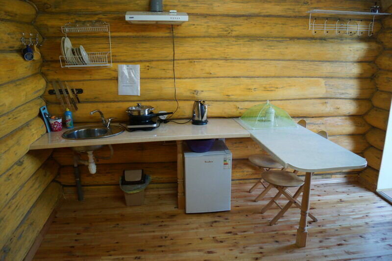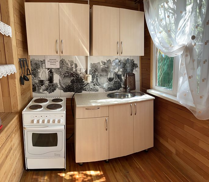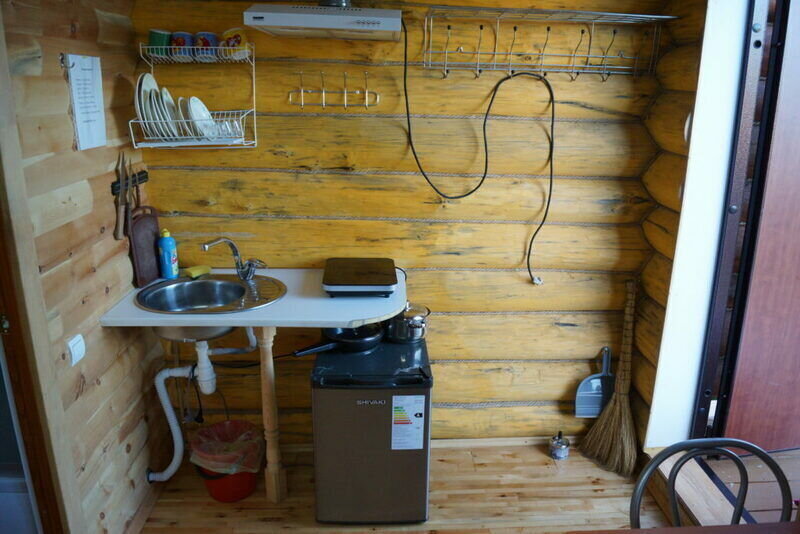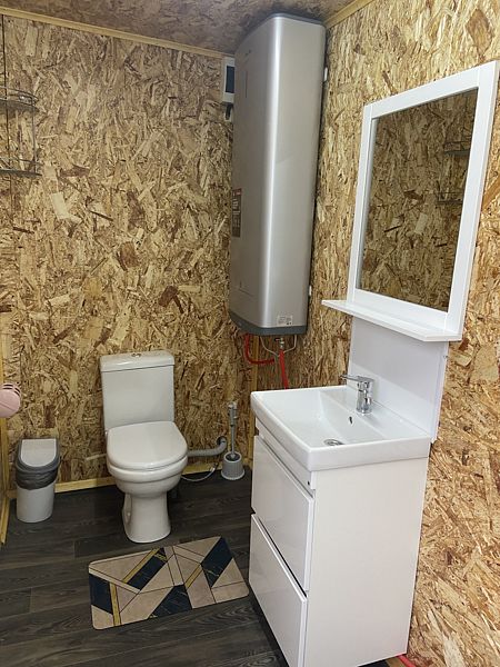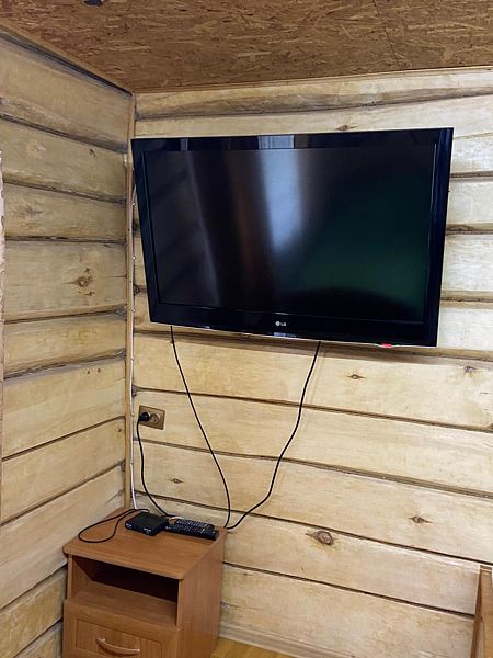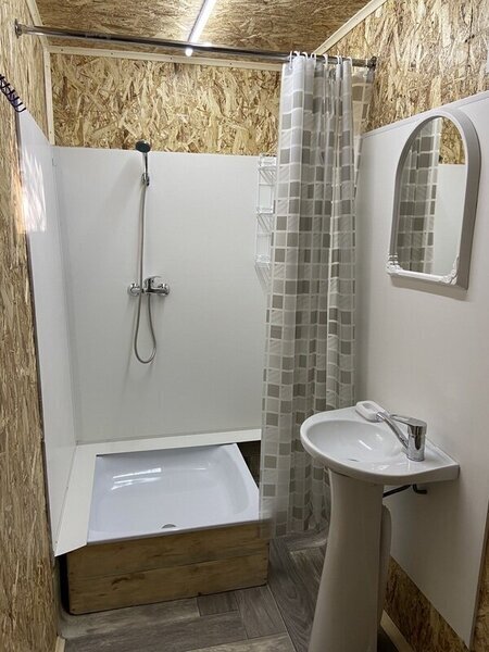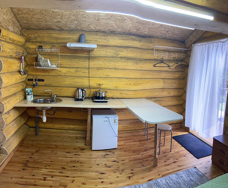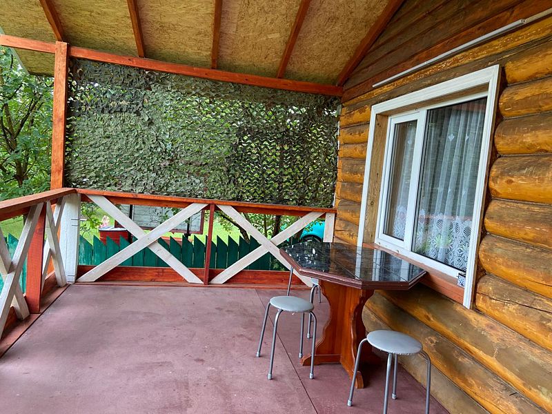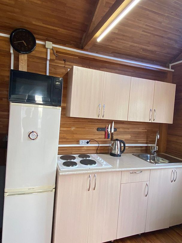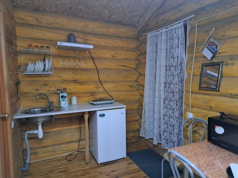 В домике есть своя крытая терраса, кухня, большой телевизор, холодильник, кондиционер. Запах свежего дерева, домашний уют, удобное расположение на территории. Санузел внутри дома.