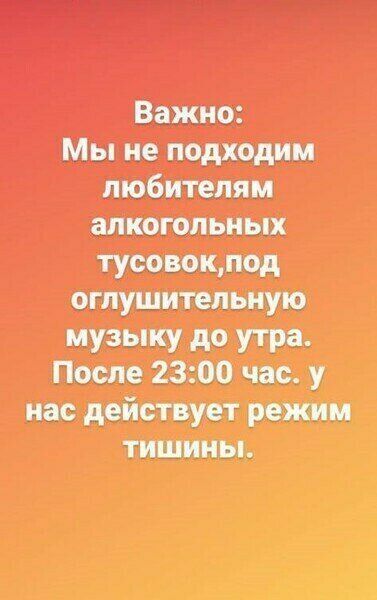 На территории базы действует режим тишины после 23:00. Громкая музыка, шумные вечеринки до утра запрещены. Только семейный тихий отдых.