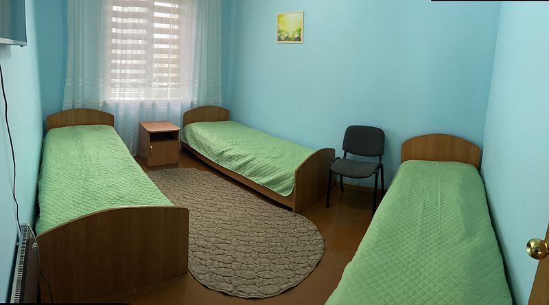 В спальне 3 односпальные кровати, телевизор, тумбочка.