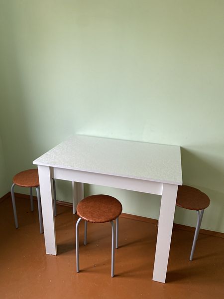 Просторная кухня столовая, проведена вода, кухонный гарнитур, плита, холодильник, стол, стулья, набор посуды.