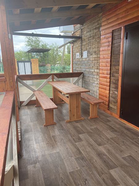 Просторная крытая терраса для отдыха на которой располагаются стол и стулья.